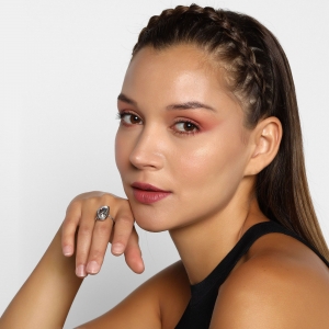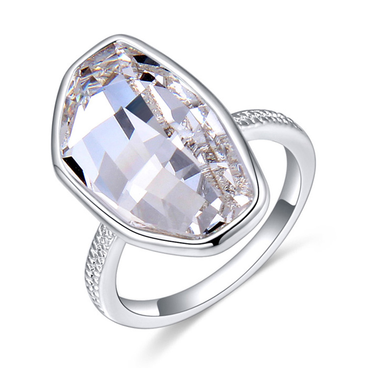 Delicado anillo en baño de oro blanco de 18 quilates, diseño asimétrico, con incrustación de cristal en color blanco.