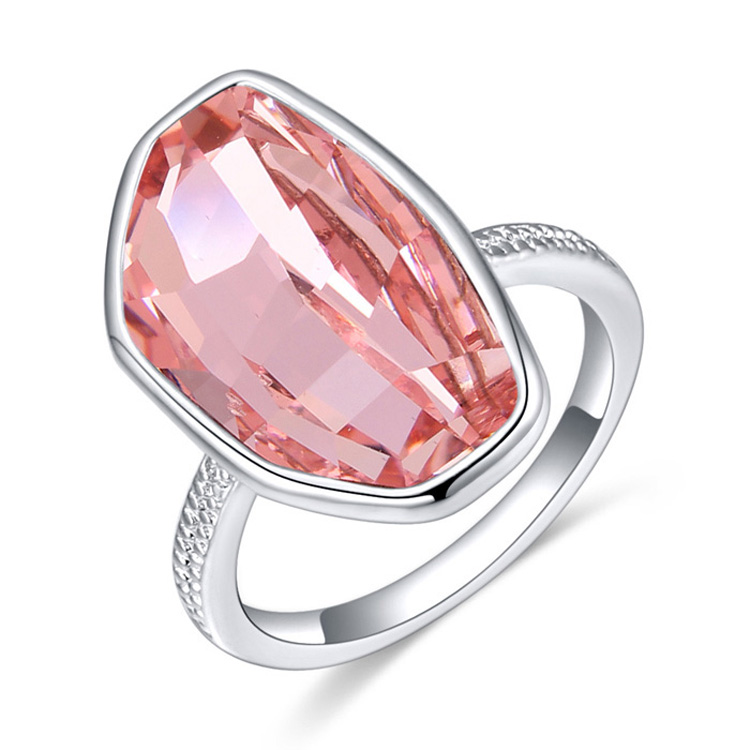 Delicado anillo en baño de oro blanco de 18 quilates, diseño asimétrico, con incrustación de cristal en color rosa.