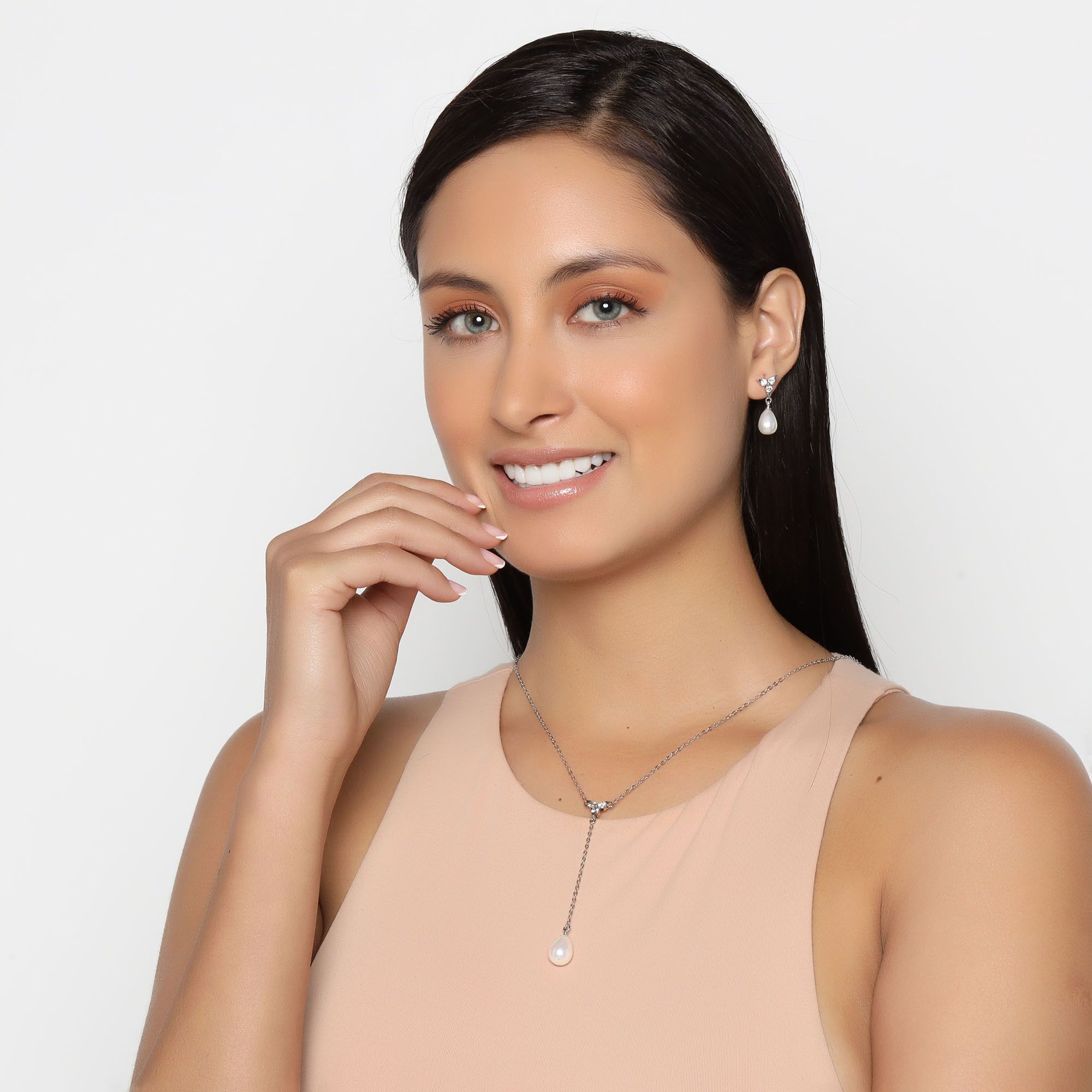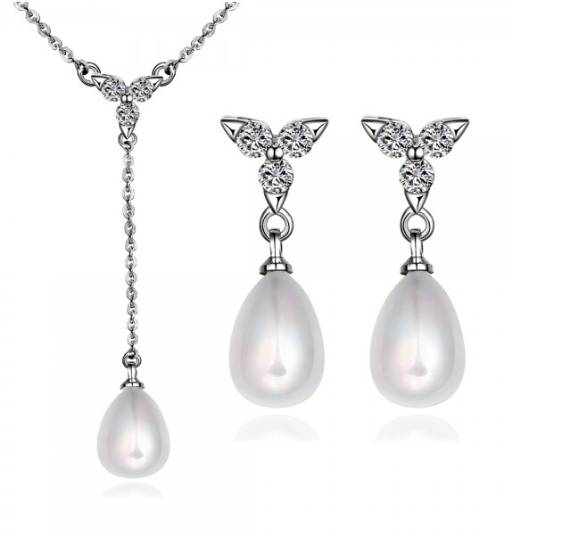 Juego de aretes y dije en baño de oro blanco de 18 quilates, diseño de perla con incrustación de cristales en color blanco.