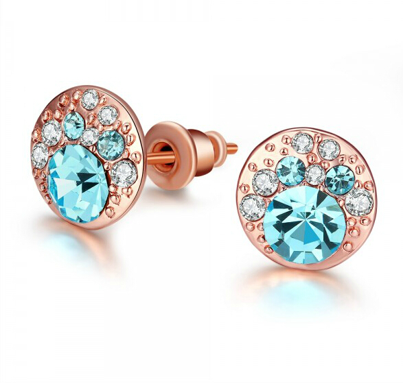 Aretes en baño de oro rosa de 18 quilates, diseño de círculo, con incrustación de cristales en colores azul y blanco.