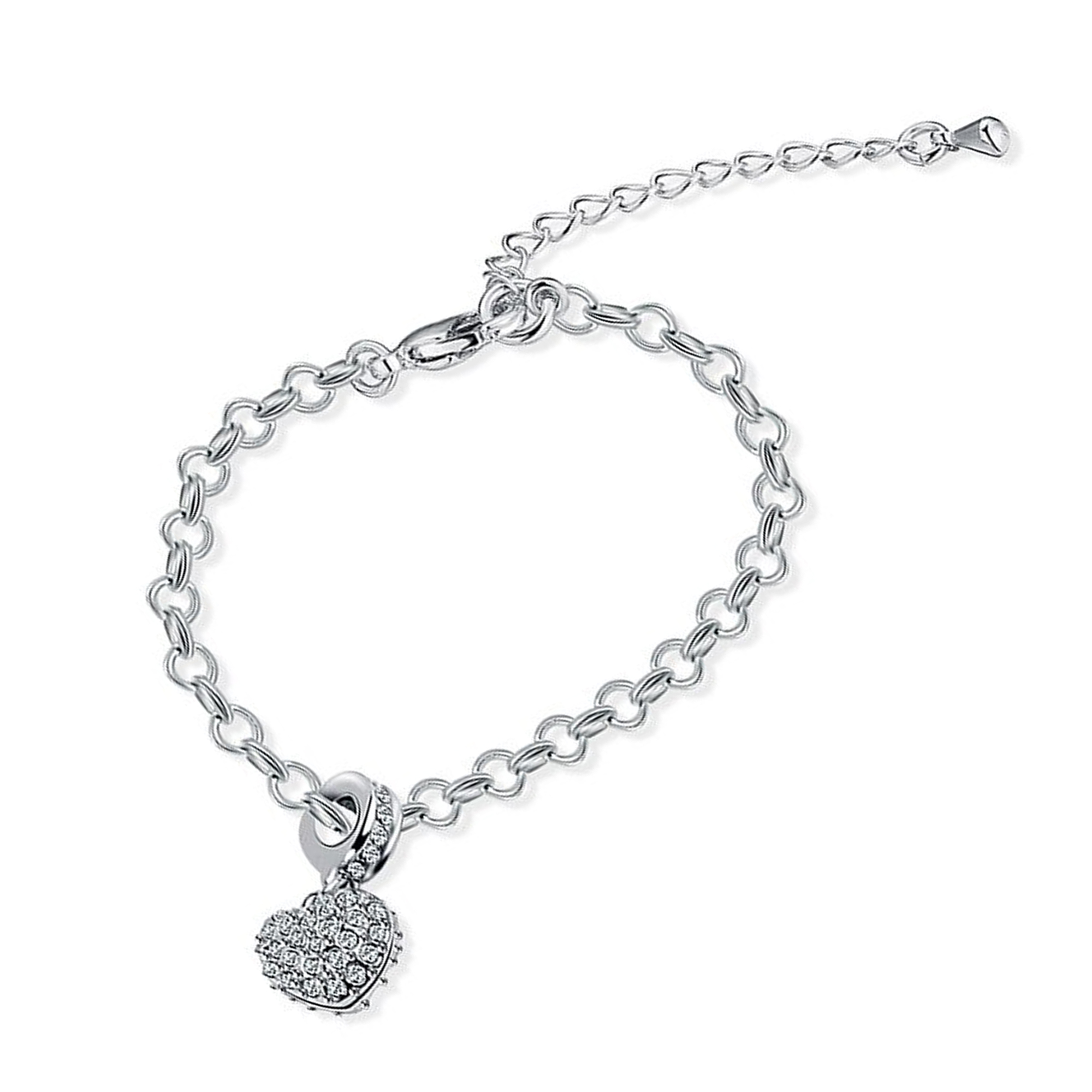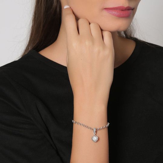 Pulsera en baño de oro blanco de 18 quilates, diseño de eslabones, con dije en forma de corazón e incrustaciones de cristales blancos.