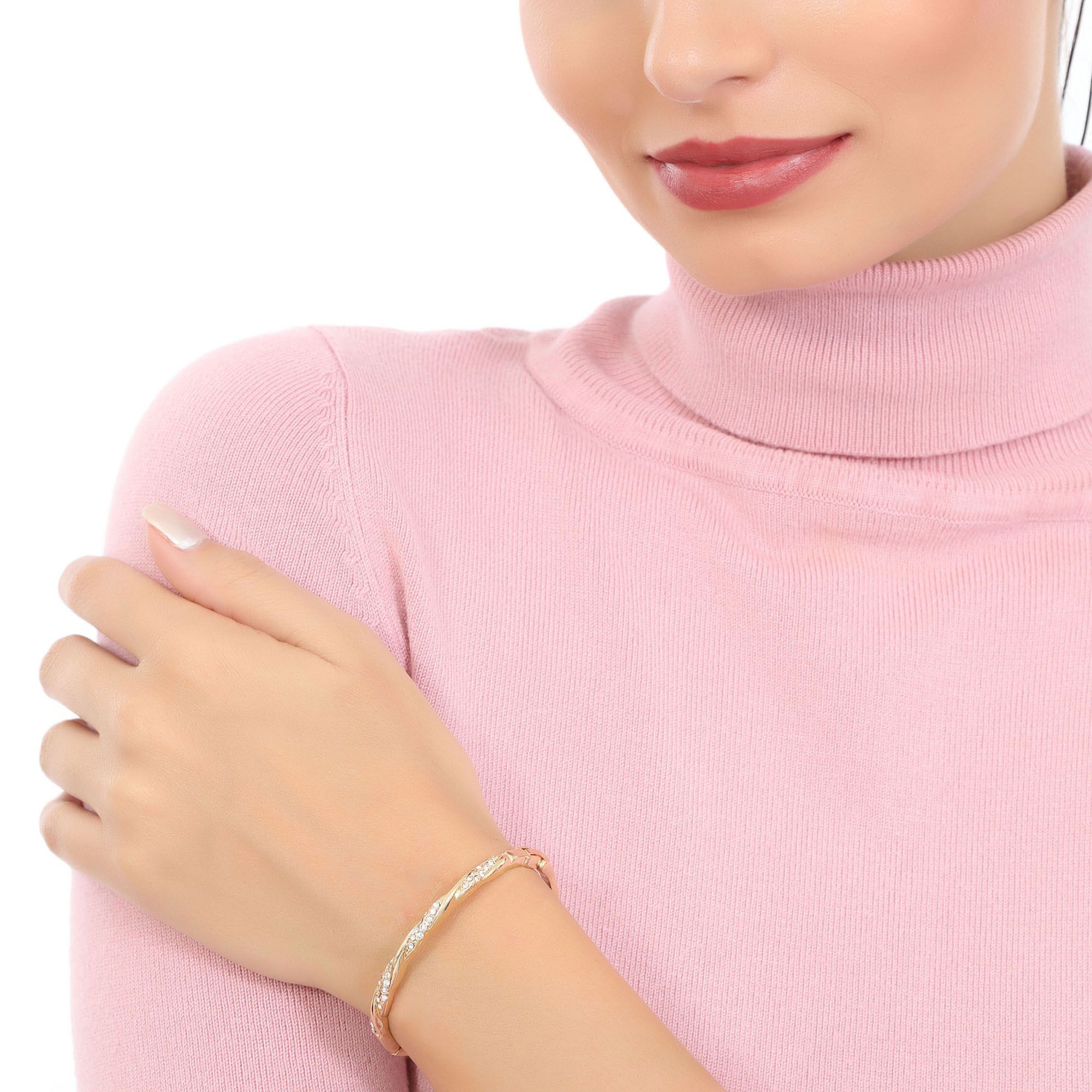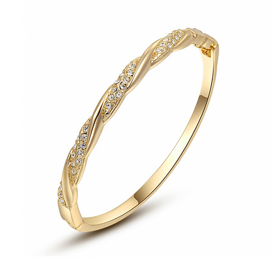 Brazalete en baño de oro amarillo de 18 quilates, diseño trenzado, en relieve, con incrustaciones de cristales en color blanco.