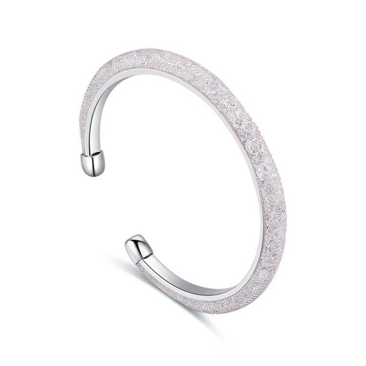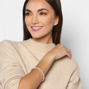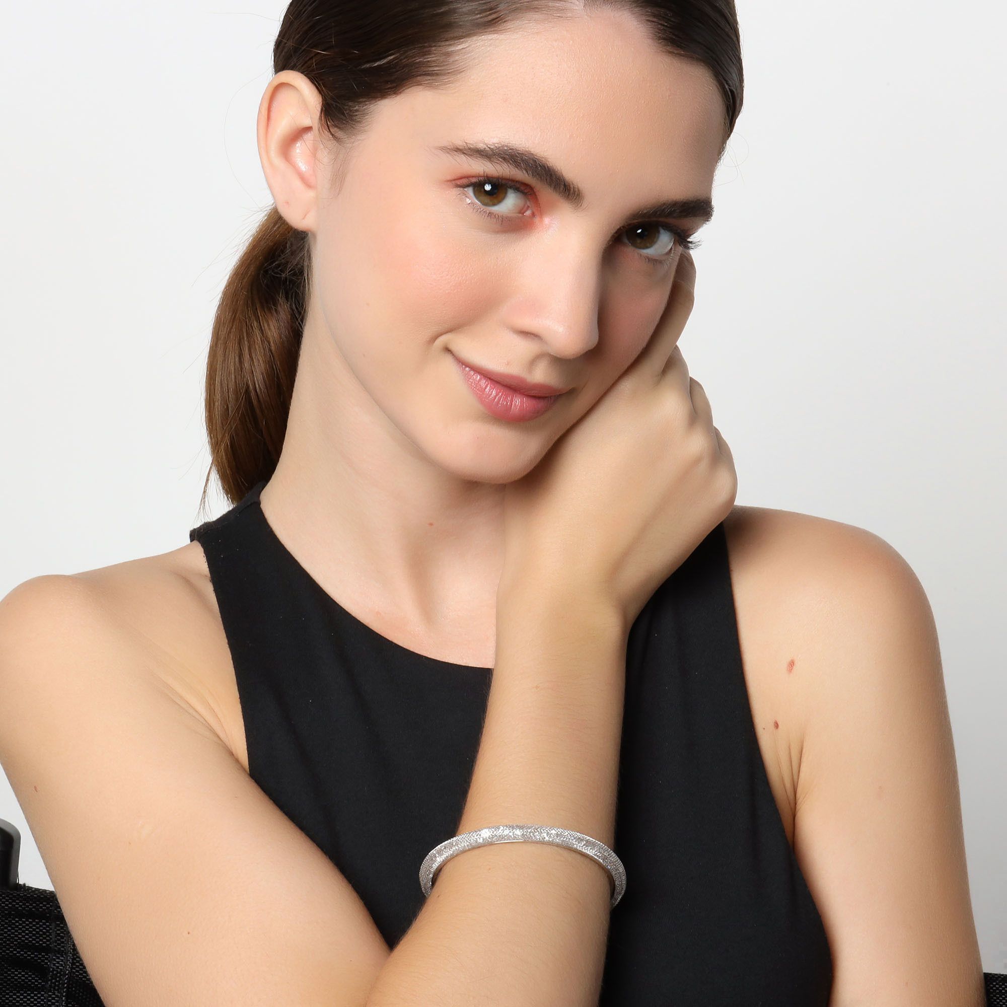 Lindo brazalete, en baño de oro blanco de 18 quilates, diseño de red con cristales en color blanco dentro.