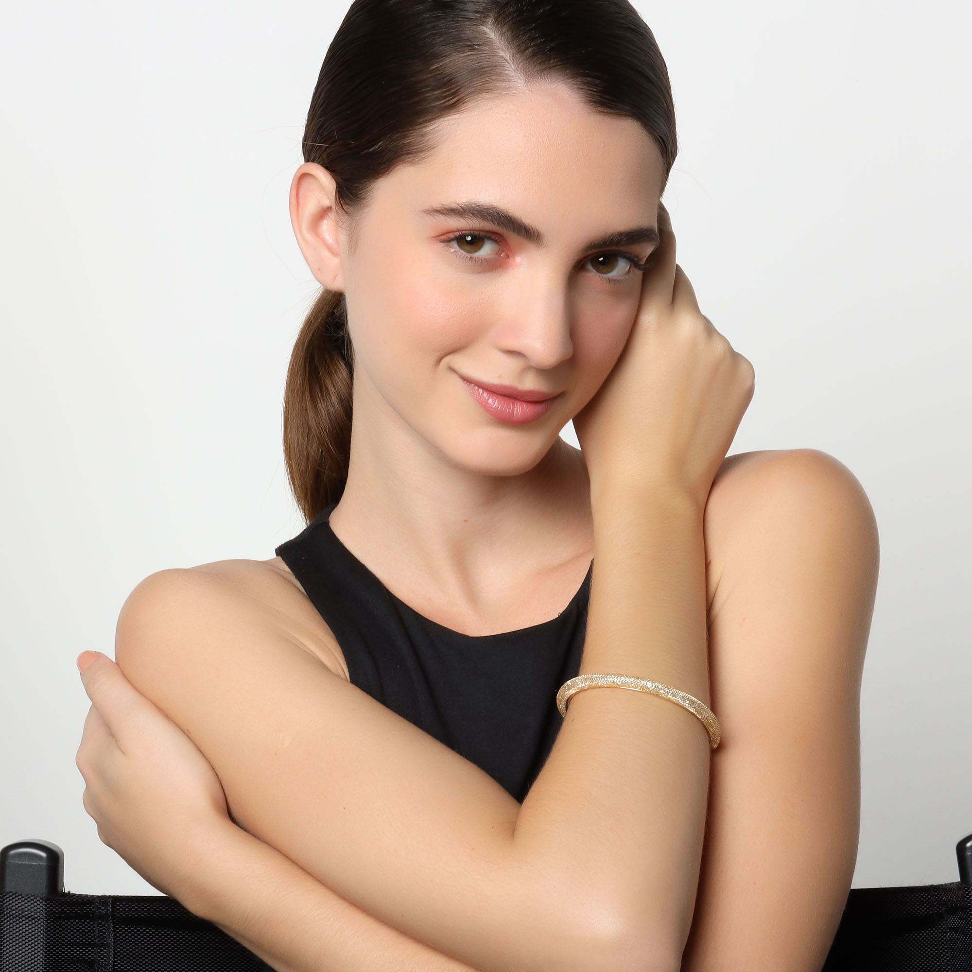 Lindo brazalete, en baño de oro amarillo de 18 quilates, diseño de red con cristales en color blanco dentro.