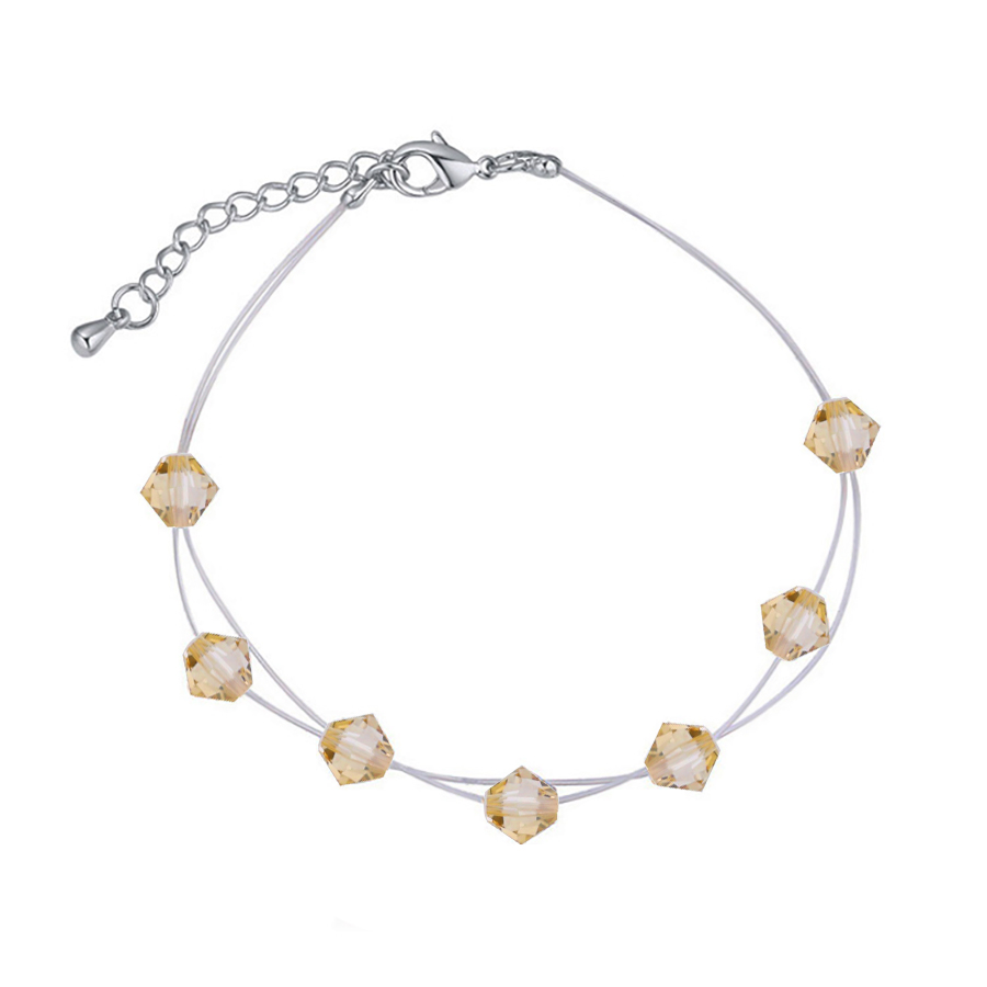 Fina pulsera en baño de oro blanco de 18 quilates, correa de nylon, con cuentas de cristal en color ámbar.