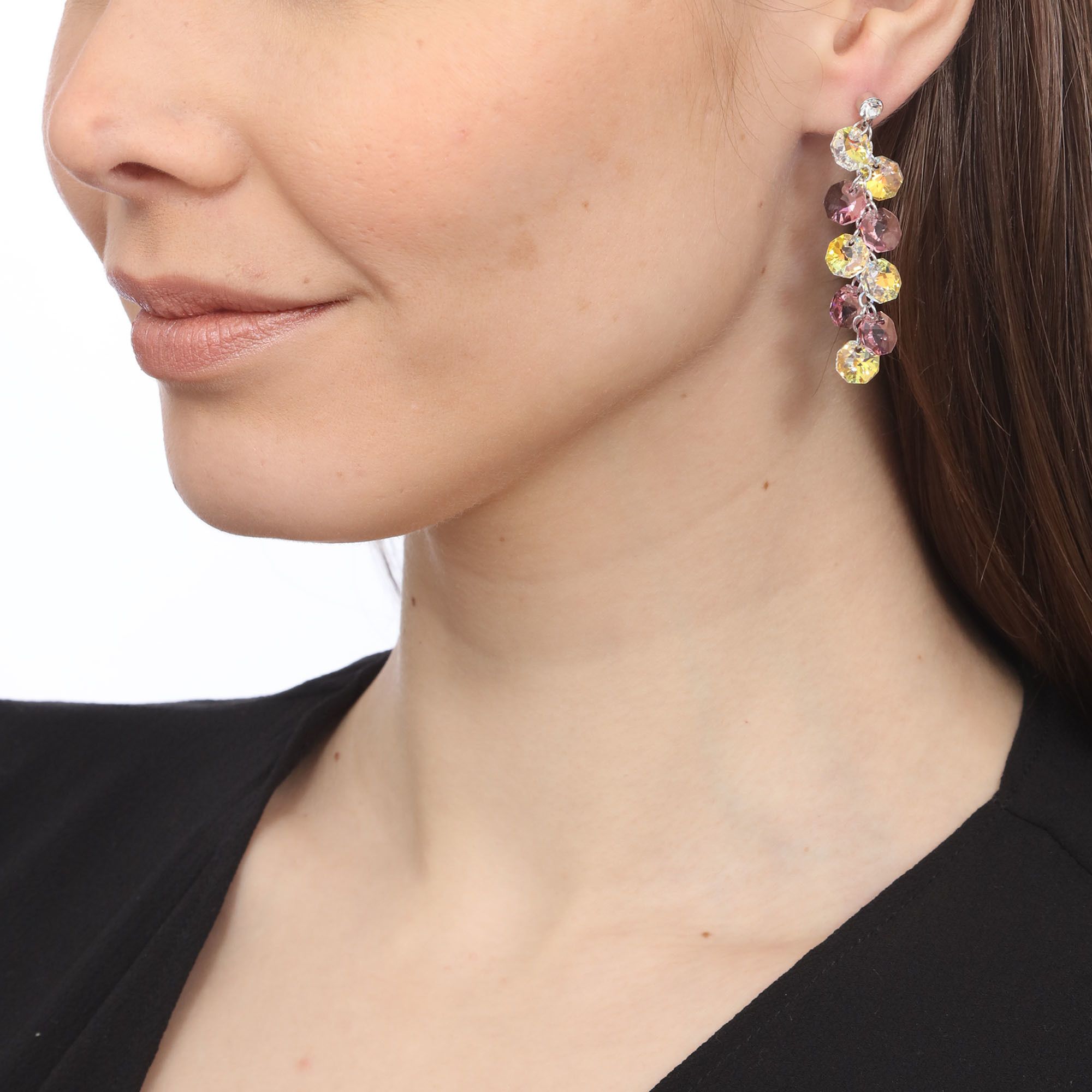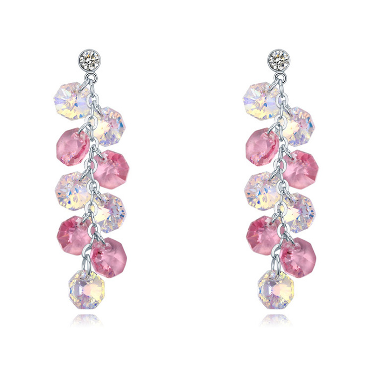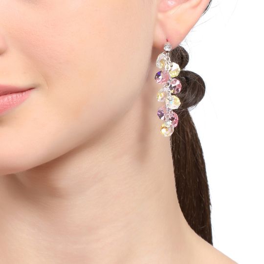 Aretes en baño de oro blanco de 18 quilates, fino diseño, estilo racimo, con cristales en color rosa y tornasol.