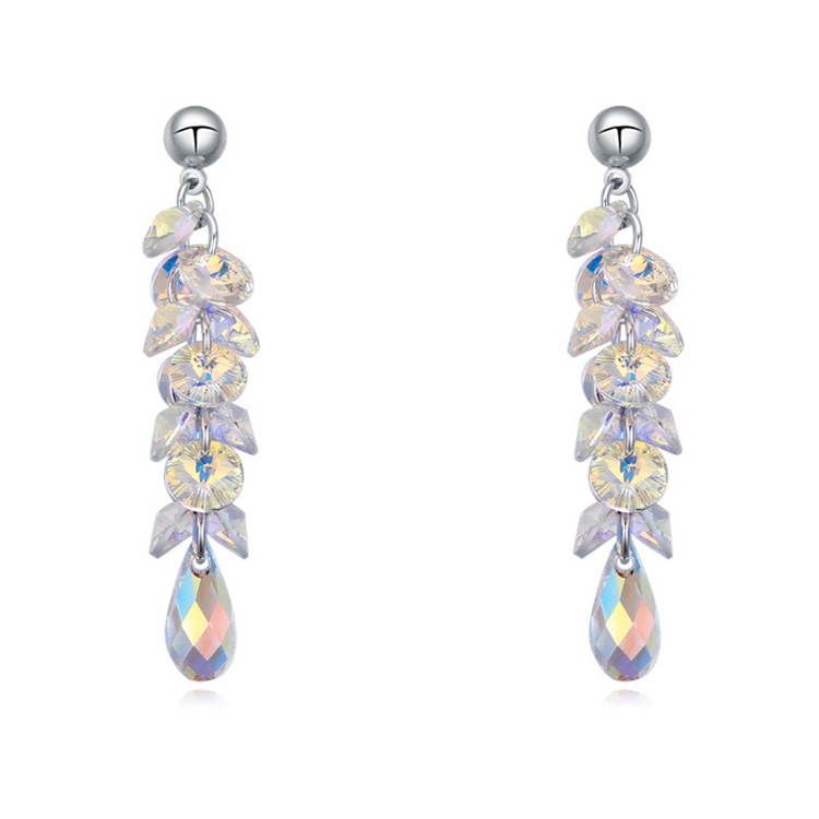 Aretes en baño de oro blanco de 18 quilates, fino diseño, estilo cascada, con cristales en color tornasol.