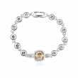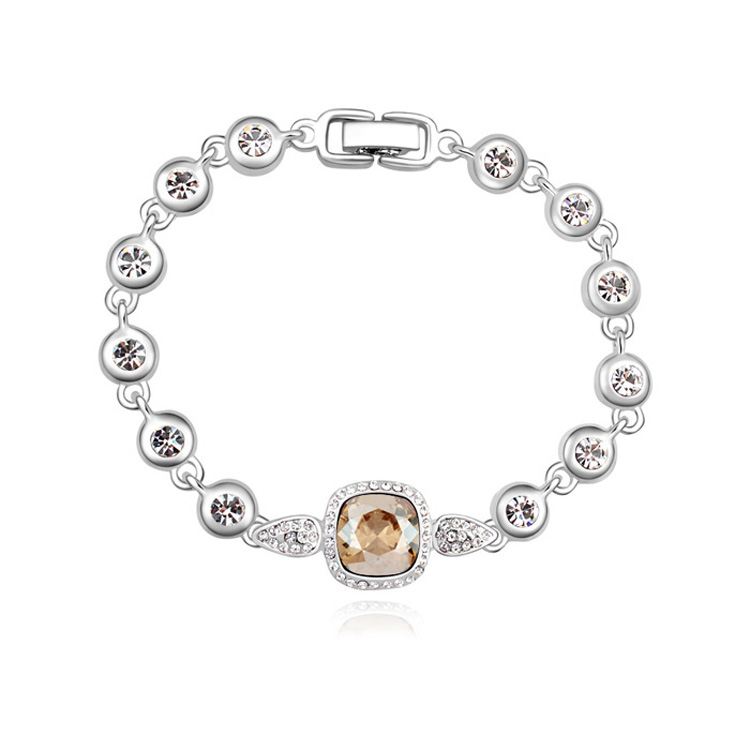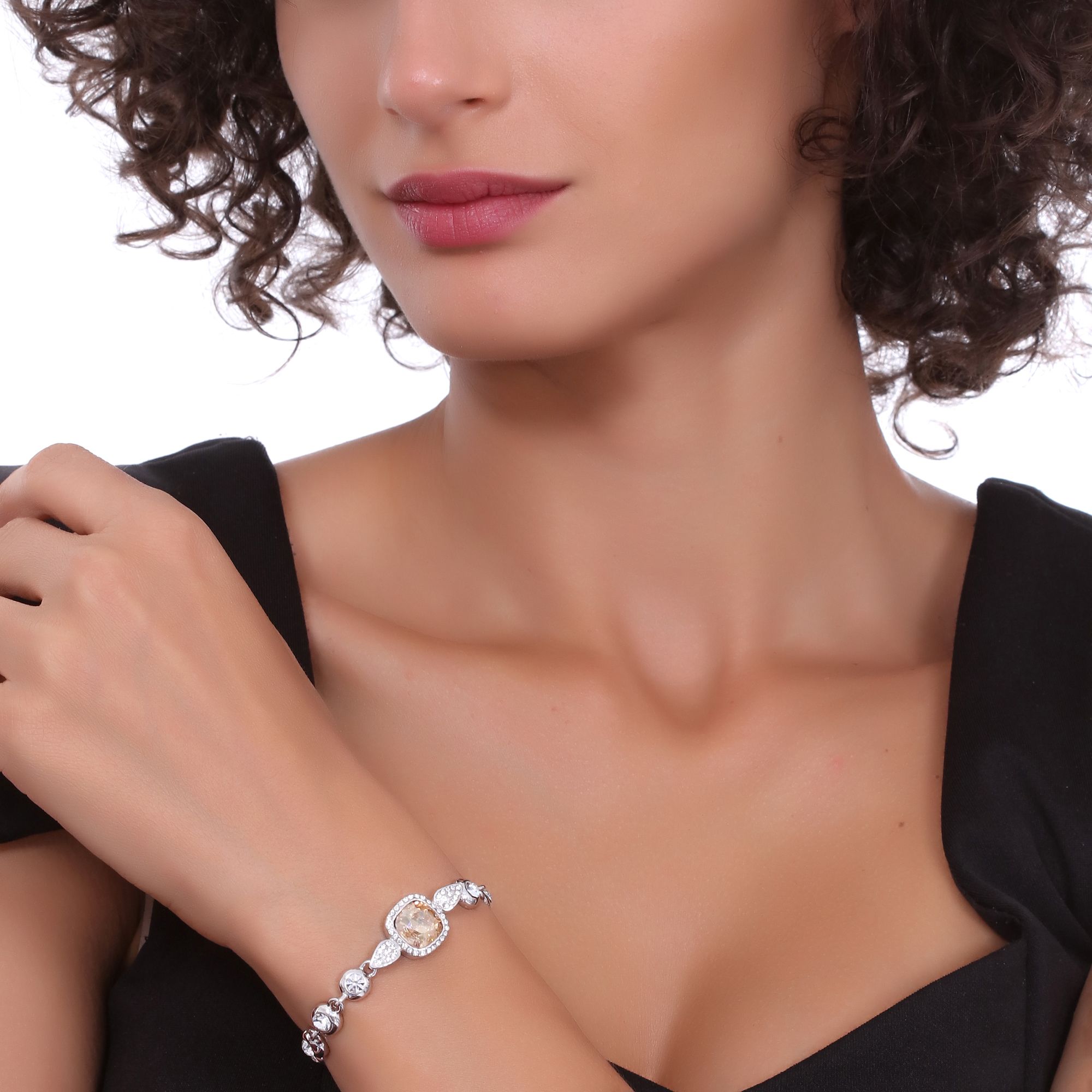 Linda pulsera, en baño de oro blanco de 18 quilates, bello diseño, con cristal ámbar corte cushion, crsitales blancos corte brillante, e incrustaciones de pequeños cristales blancos. Fabricado en una estructura de aleación de platino con rodio sin níquel.