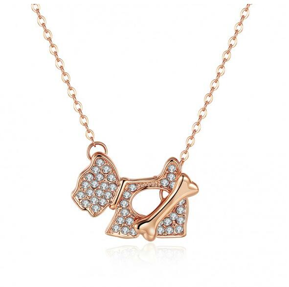 Dije con cadena en baño de oro rosa de 18 quilates, diseño de perrito con incrustaciones de cristales blancos.