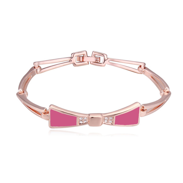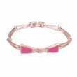 Brazalete en baño de oro rosa de 18 quilates, diseño de moño, con esmaltado color rosa e incrustación de cristales blancos.