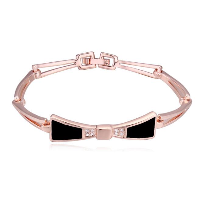 Brazalete en baño de oro rosa de 18 quilates, diseño de moño, con esmaltado color negro e incrustaciones de cristales blancos.