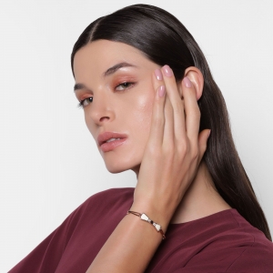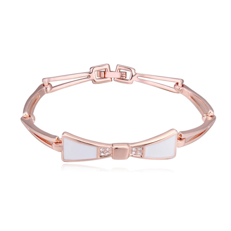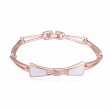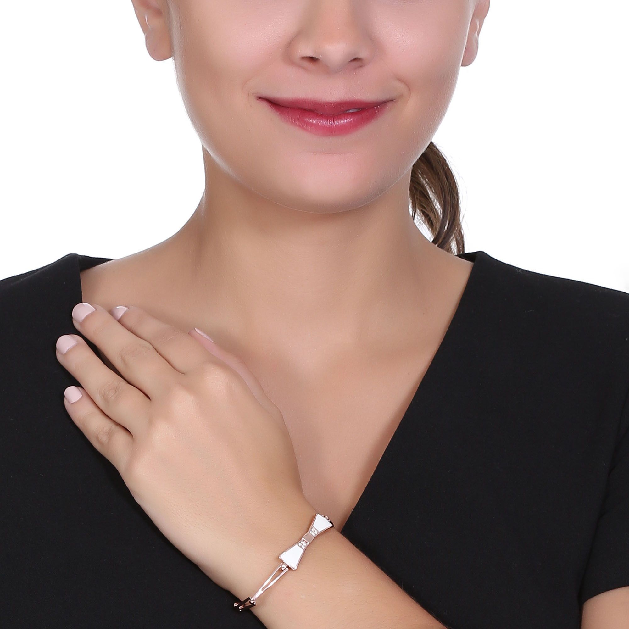 Brazalete en baño de oro rosa de 18 quilates, diseño de moño, con esmaltado color blanco e incrustaciones de cristales blancos.