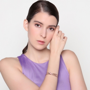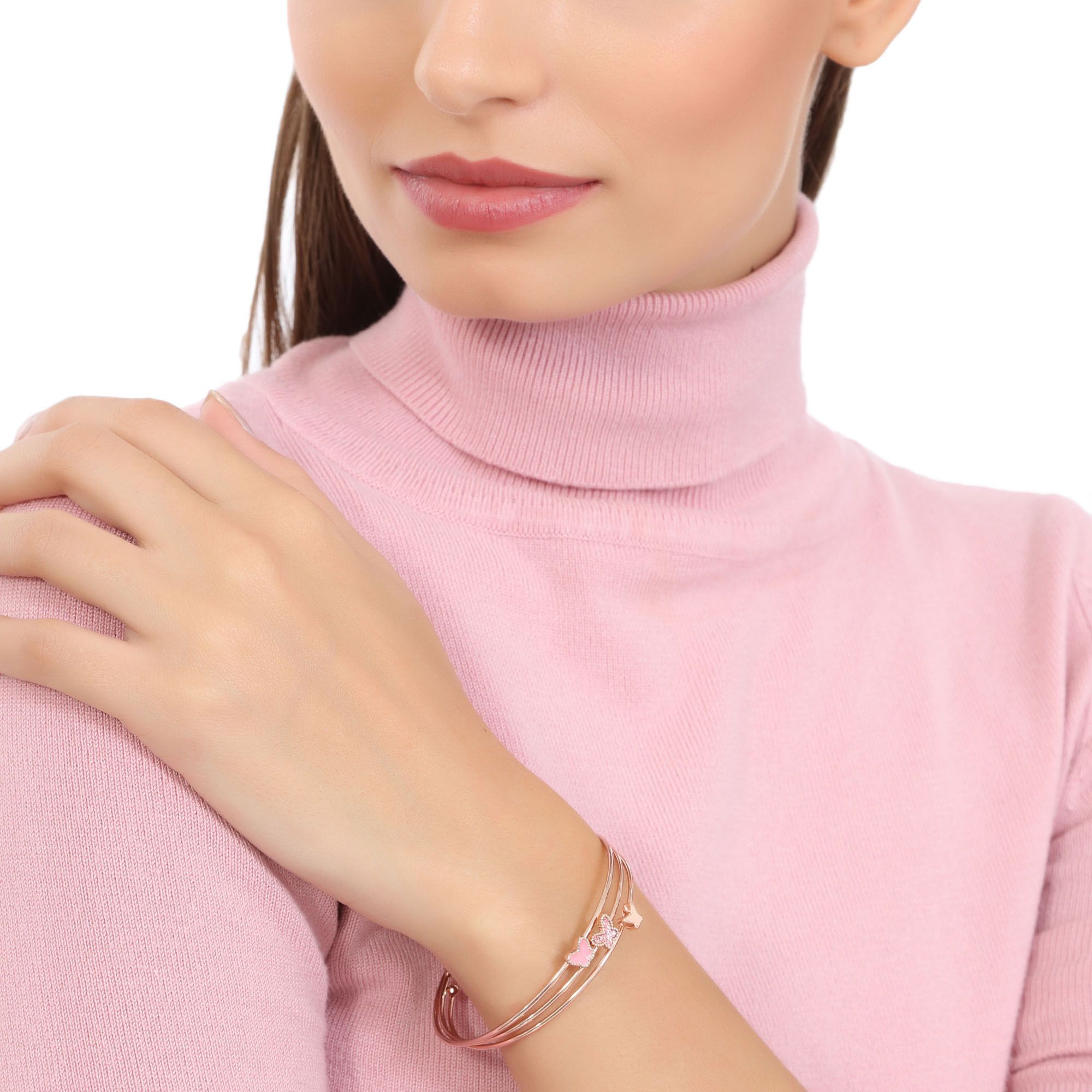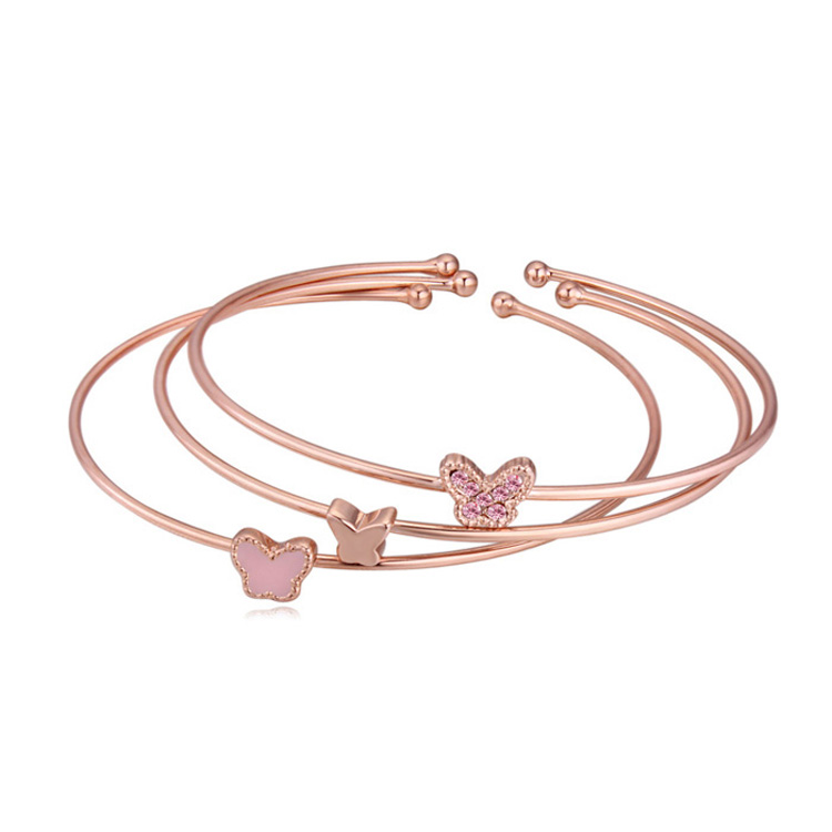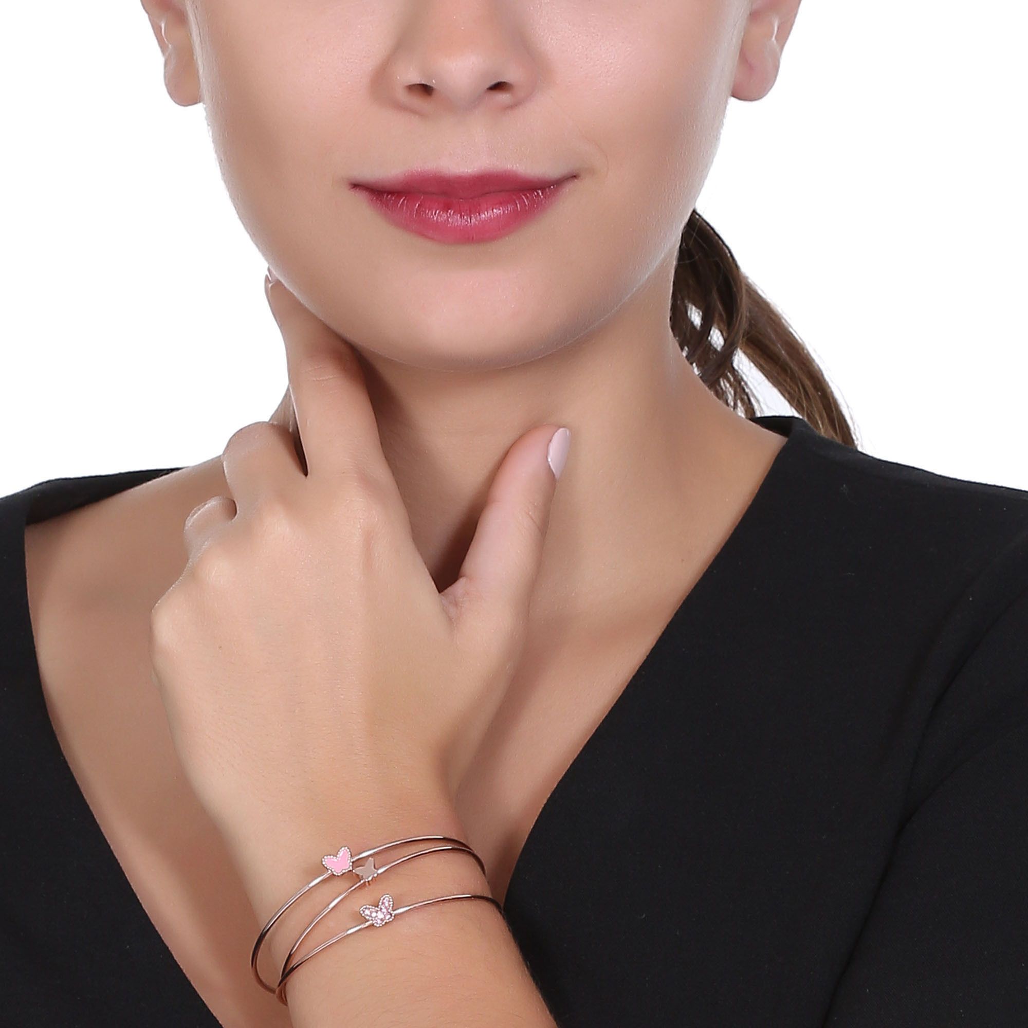 Lindo juego de tres brazaletes, en baño de oro rosa de 18 quilates, diseño de mariposa, con esmaltado color rosa e incrustaciones de cristales rosas.