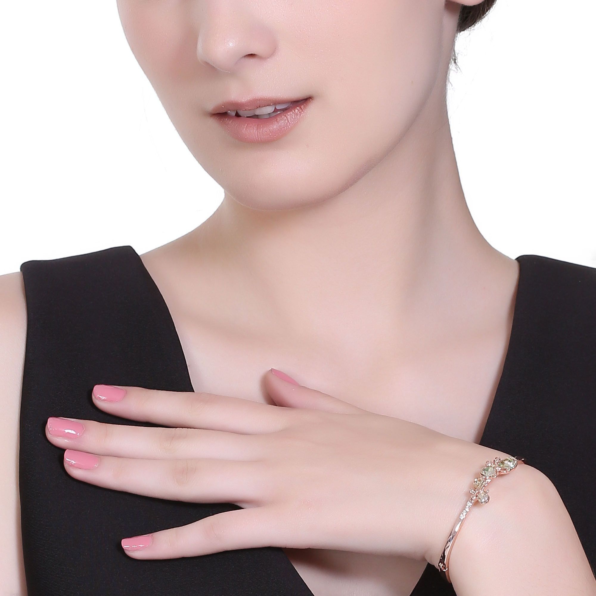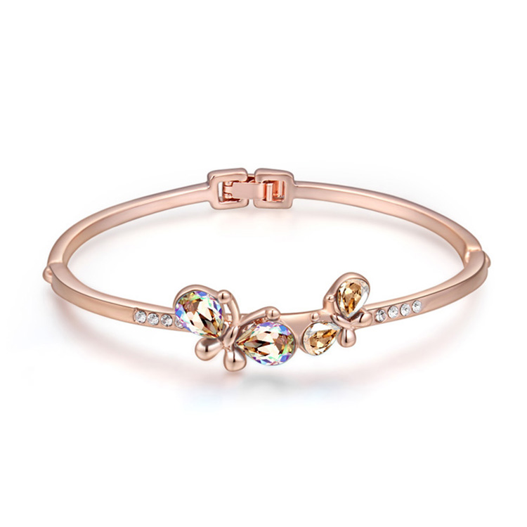 Brazalete en baño de oro rosa de 18 quilates, fino diseño de mariposas, con incrustaciones de cristal en color ámbar y blanco.