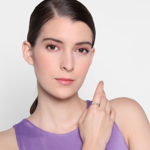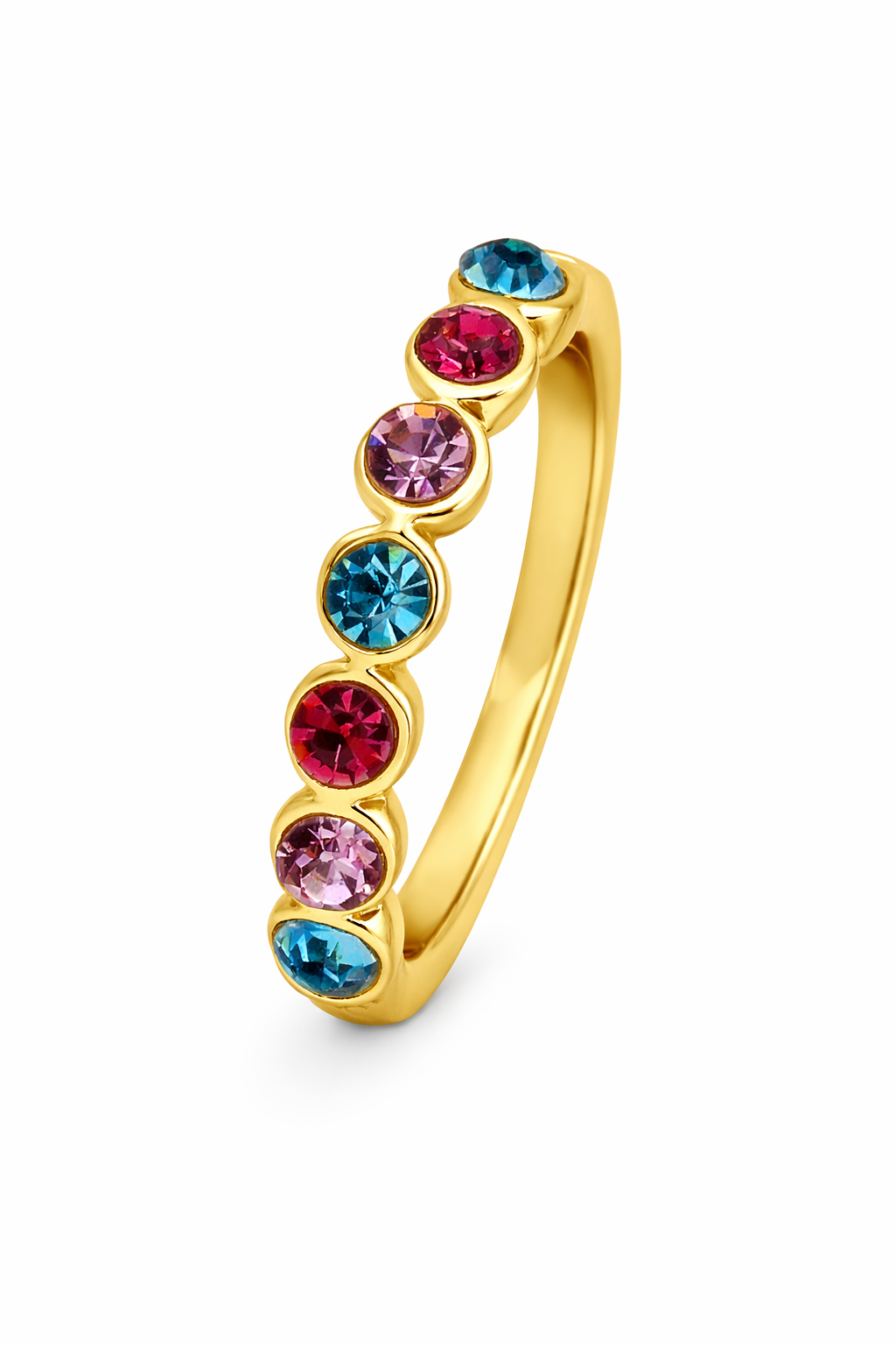 Anillo en baño de oro amarillo de 18 quilates, fino diseño, con incrustación de cristales en color rosa, fucsia y azul.