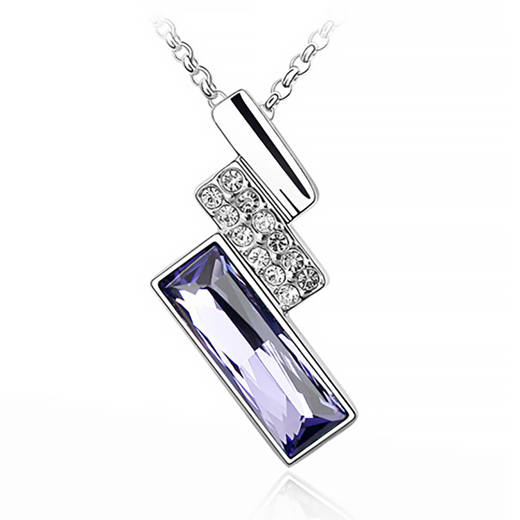 Dije con cadena en baño de oro banco de 18 quilates, diseño de rectángulo con cristal corte baguette en color morado e incrustaciones de cristales blancos.