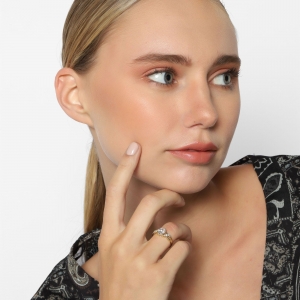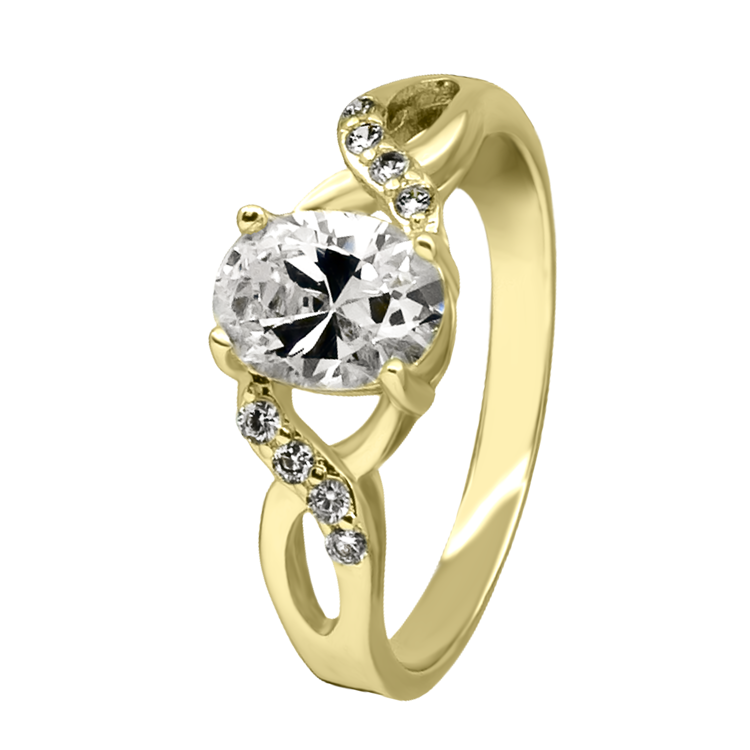 Anillo en baño de oro amarillo de 18 quilates, fino diseño entrelazado, con cristal blanco corte oval e incrustaciones de cristales en color blanco.