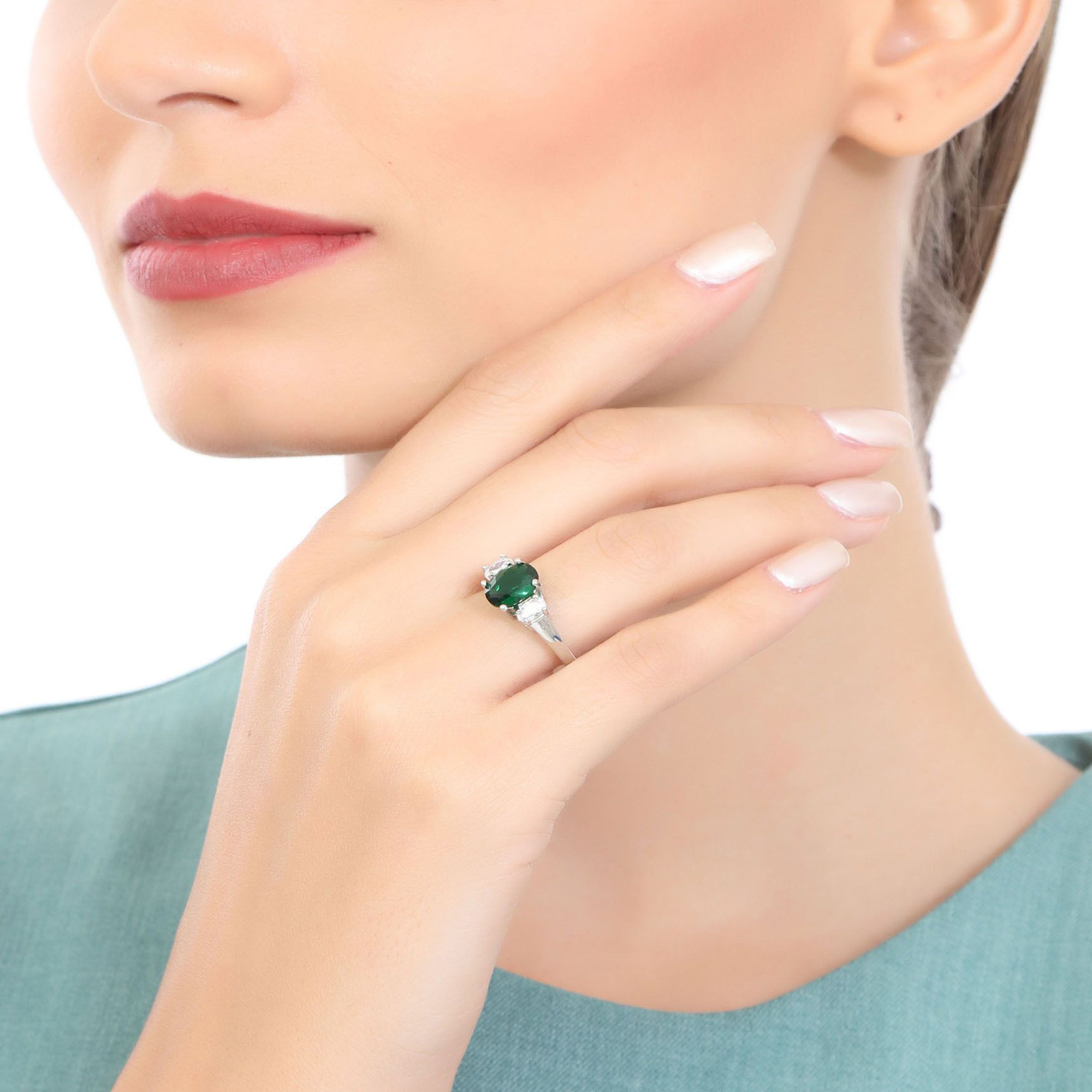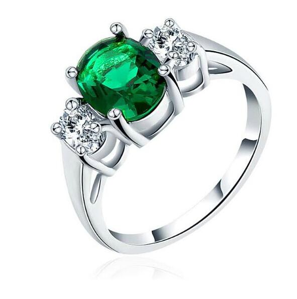 Anillo en baño de oro blanco de 18 quilates, fino diseño, con cristal verde corte brillante e incrustaciones de cristales blancos.