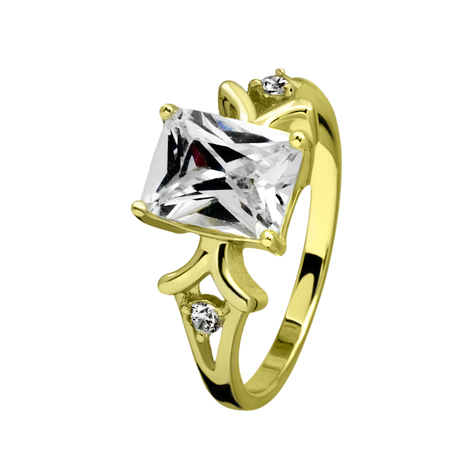 Anillo en baño de oro amarillo de 18 quilates, fino diseño, con cristal blanco corte princesa, detalles dorados e incrustaciones de cristales en color blanco.