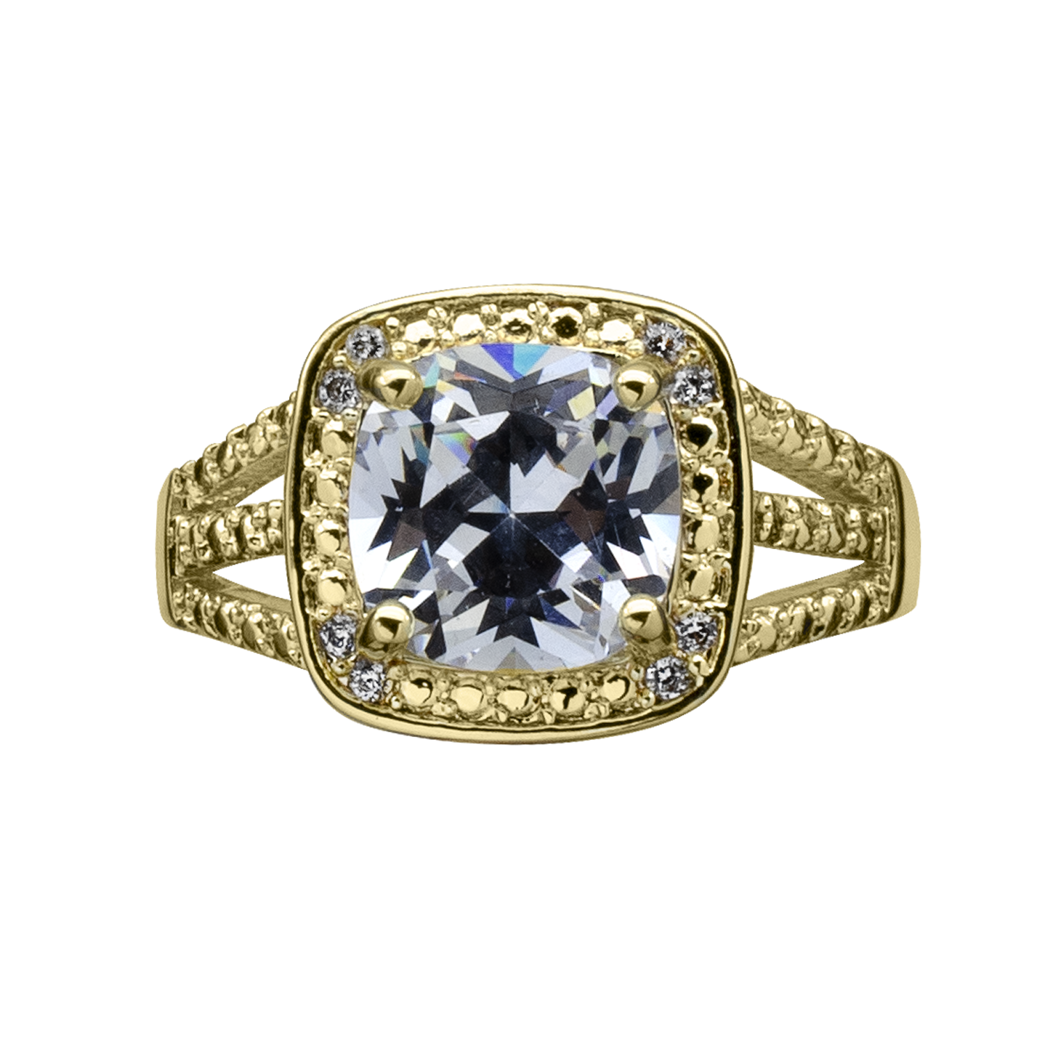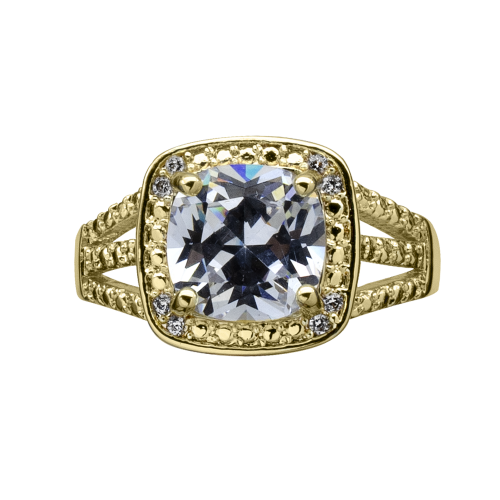 Anillo en baño de oro amarillo de 18 quilates, fino diseño, con cristal blanco corte cushion, detalles en relieve e incrustaciones de cristales en color blanco.