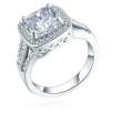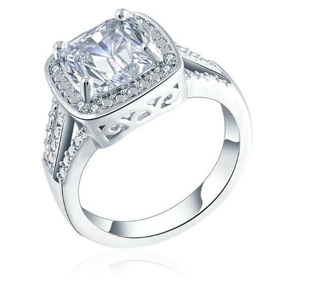 Anillo en baño de oro blanco de 18 quilates, fino diseño, con cristal blanco corte cushion, detalles en relieve e incrustaciones de cristales en color blanco.