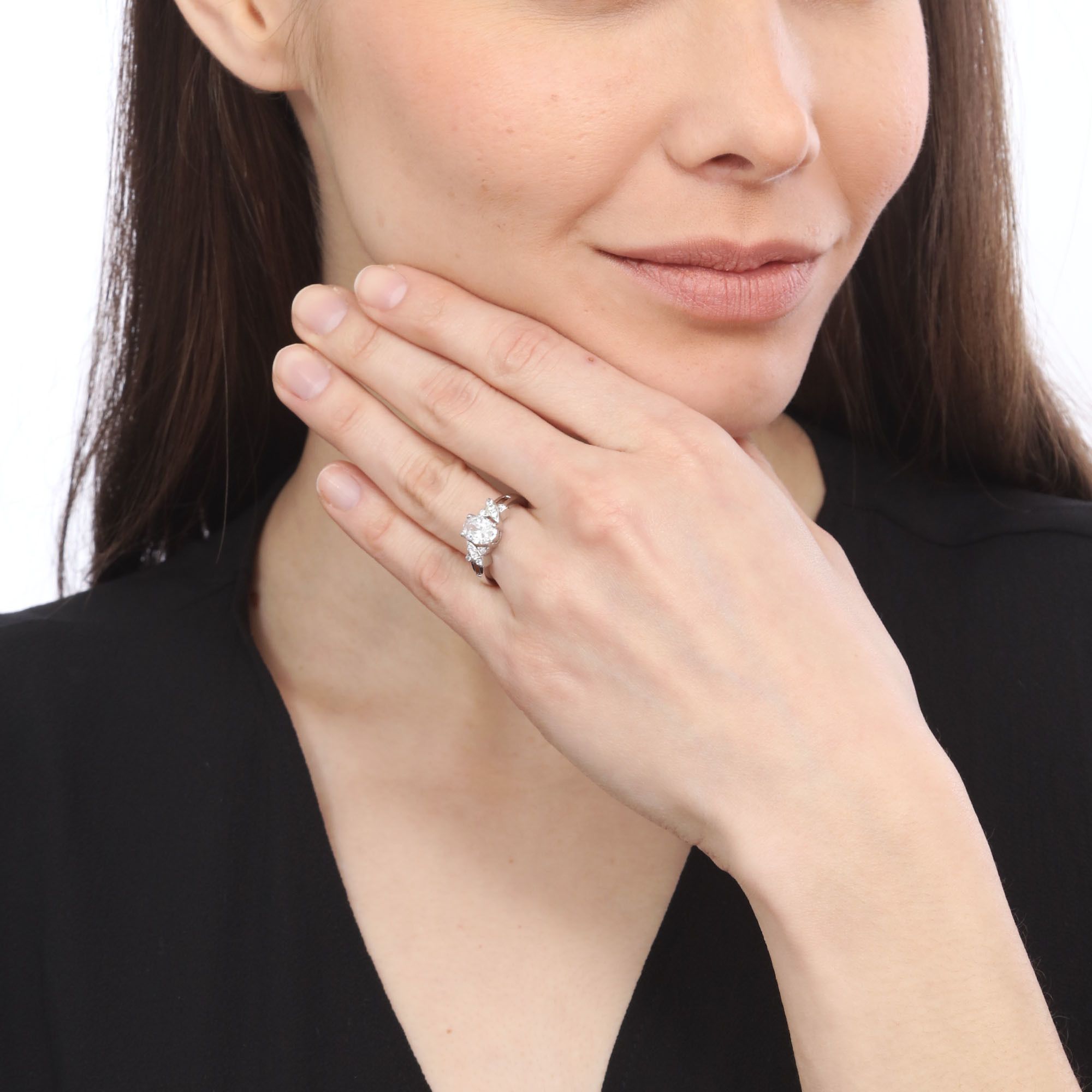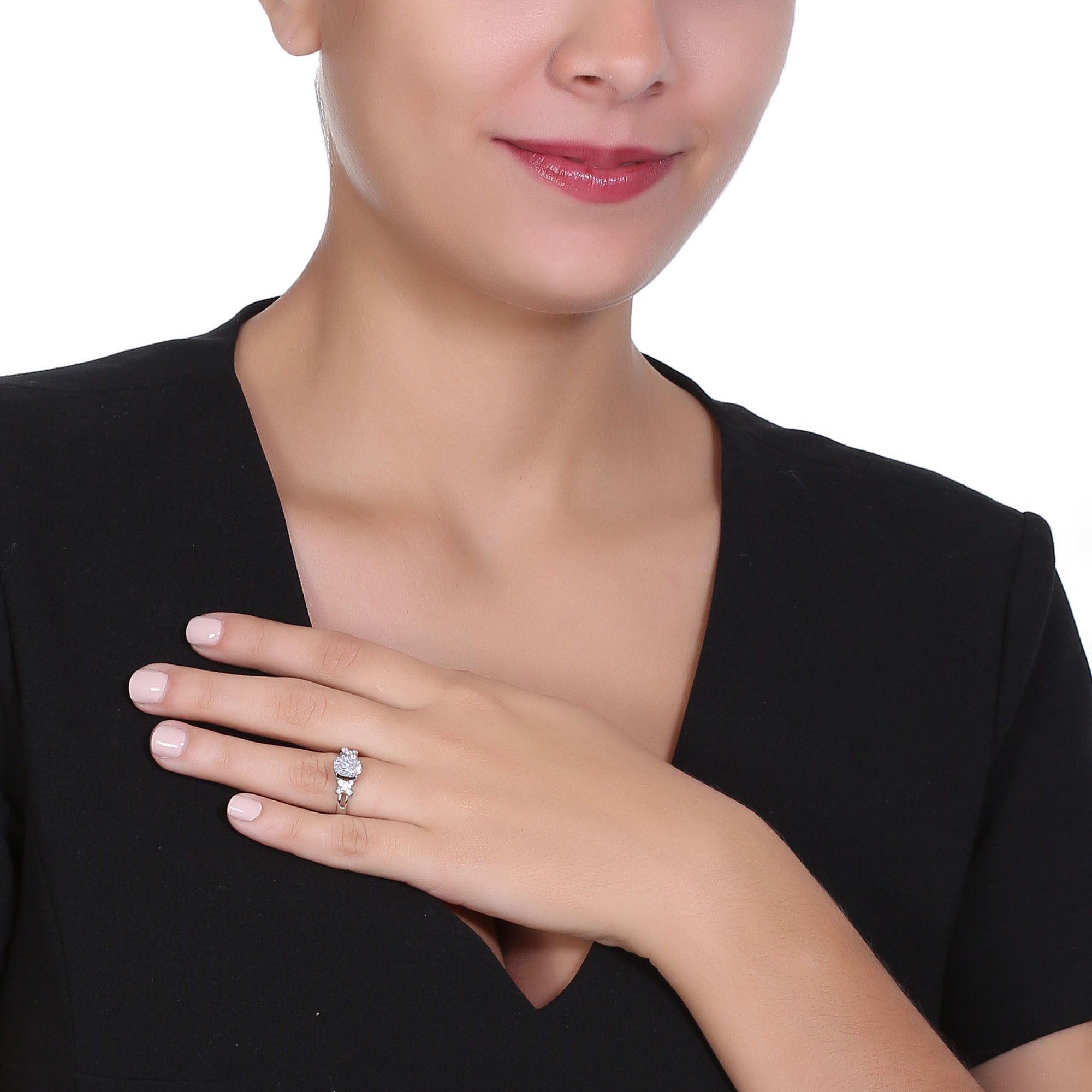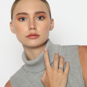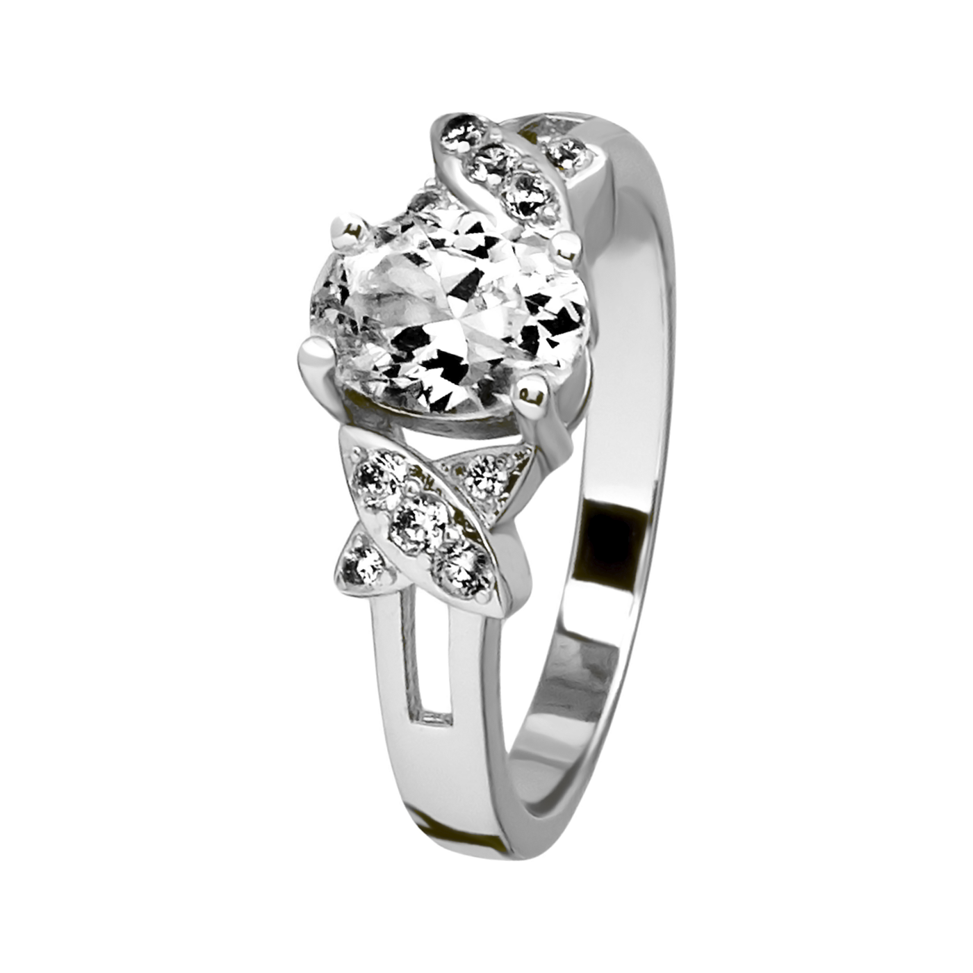 Elegante anillo en baño de oro blanco de 18 quilates, fino diseño, con cristal blanco corte brillante e incrustaciones de cristales blancos.