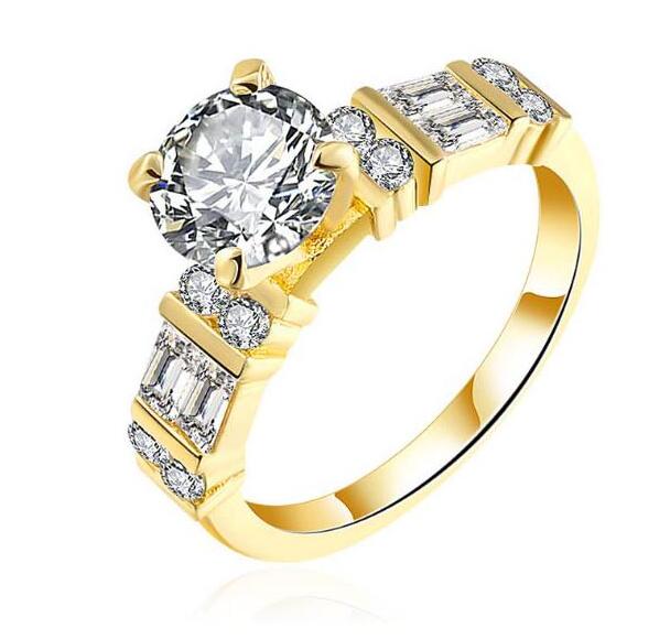 Anillo en baño de oro amarillo de 18 quilates, fino diseño, con cristal blanco corte brillante e incrustaciones de cristales corte baguette y corte brillante en color blanco.