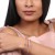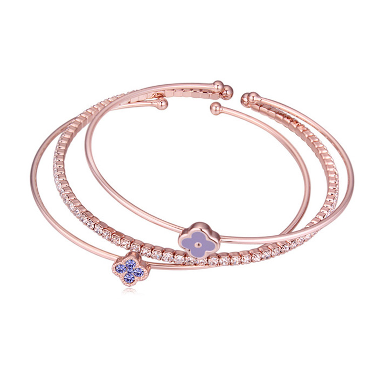 Lindo juego de tres brazaletes, en baño de oro rosa de 18 quilates, diseño de flores, con esmaltado color morado e incrustaciones de cristales morados y blancos. Fabricado en una estructura de aleación de platino con rodio sin níquel.