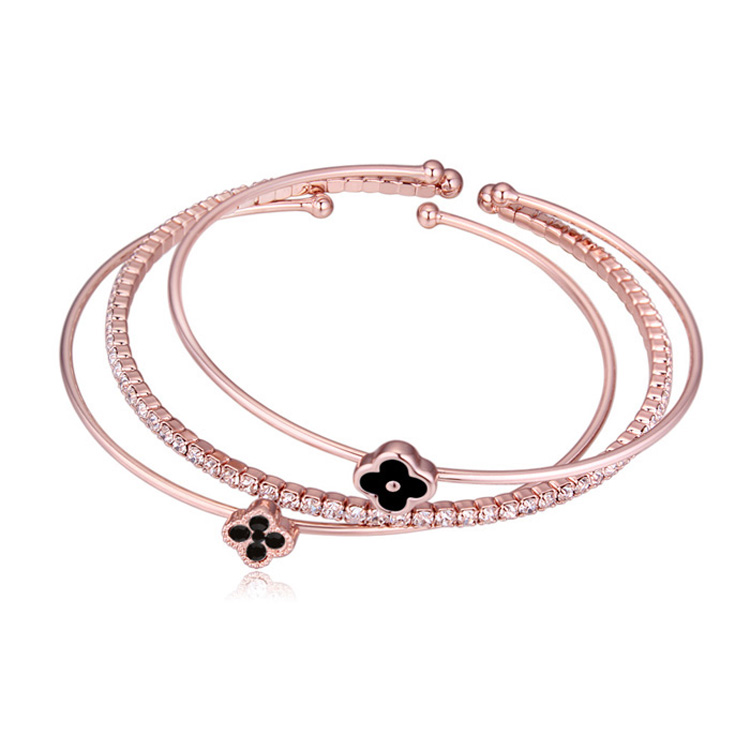 Lindo juego de tres brazaletes, en baño de oro rosa de 18 quilates, diseño de flores, con esmaltado color negro e incrustaciones de cristales negros y blancos. Fabricado en una estructura de aleación de platino con rodio sin níquel.