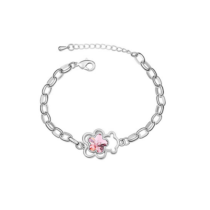 Precioso brazalete, en baño de oro blanco de 18 quilates, tierno diseño de osito, con incrustación de cristal rosa en forma de flor.
