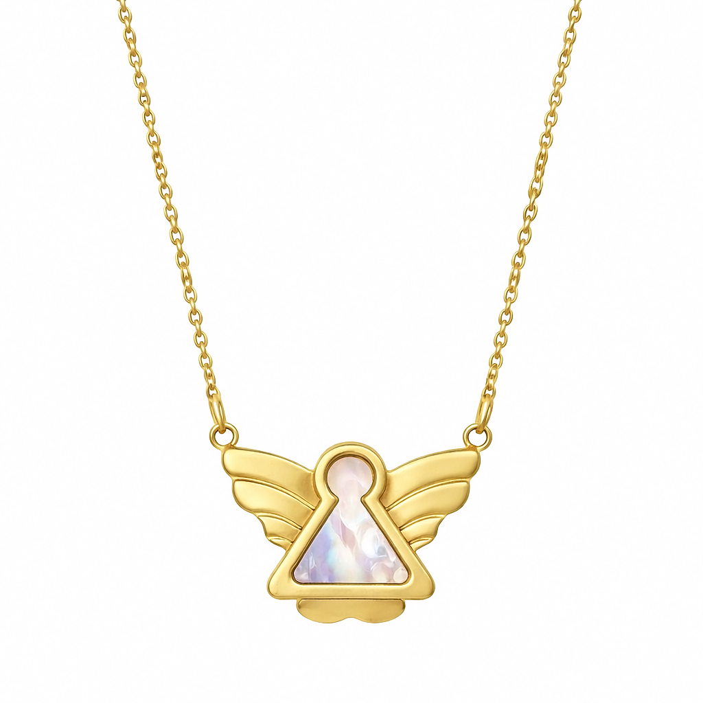 Dije con cadena en acero inoxidable color amarillo, diseño de ángel con concha nácar