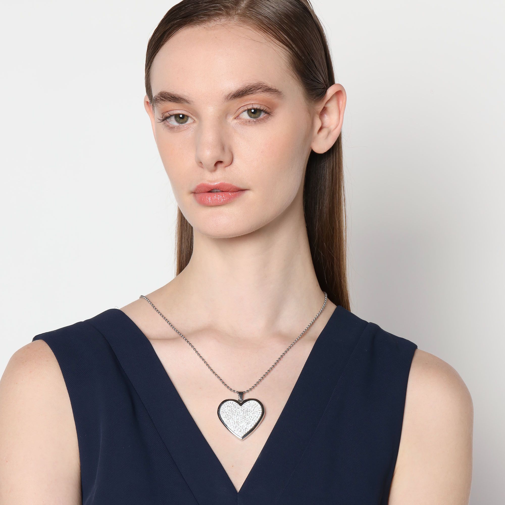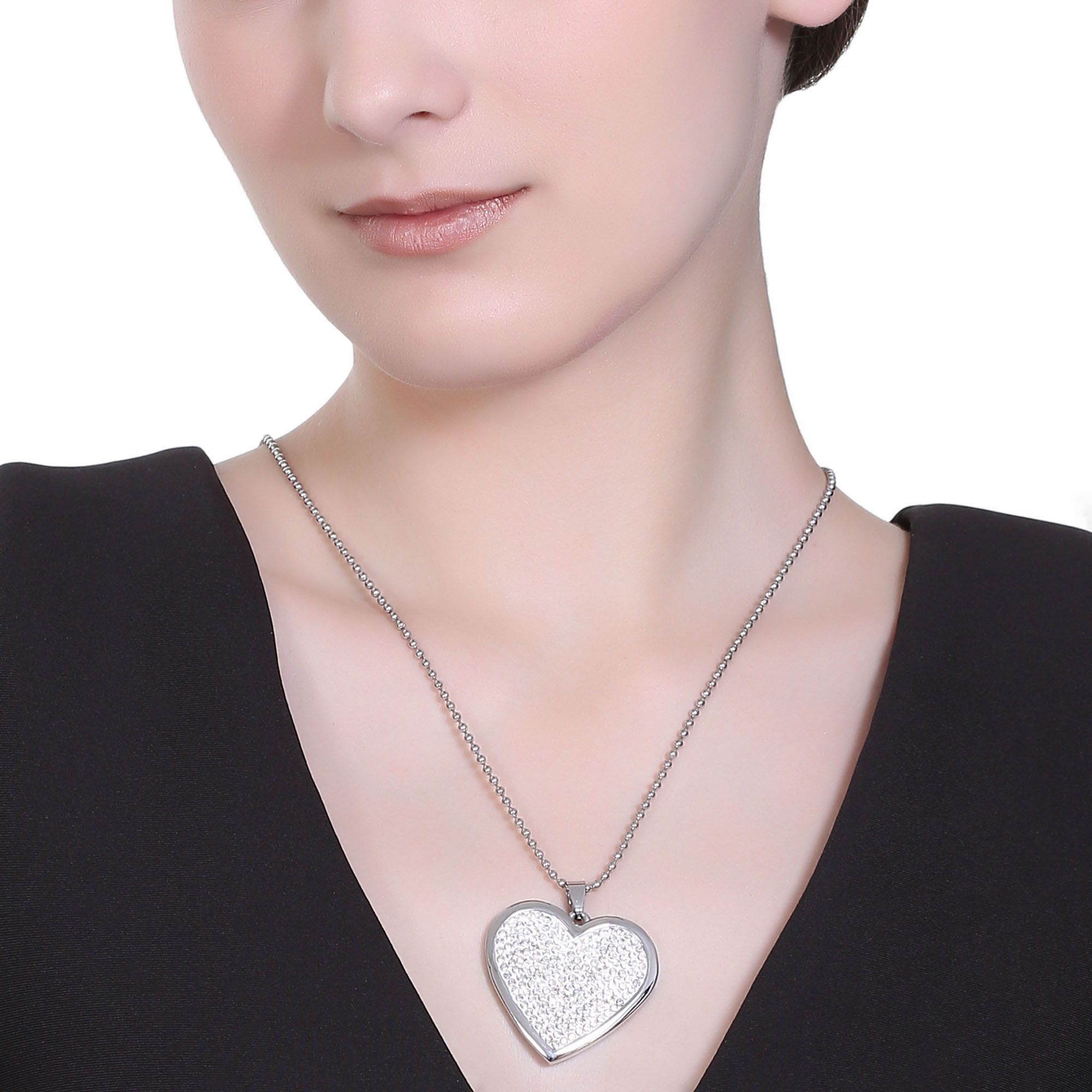 Dije con cadena en acero inoxidable, dise�o de coraz�n con incrustaciones de cristales blancos.
