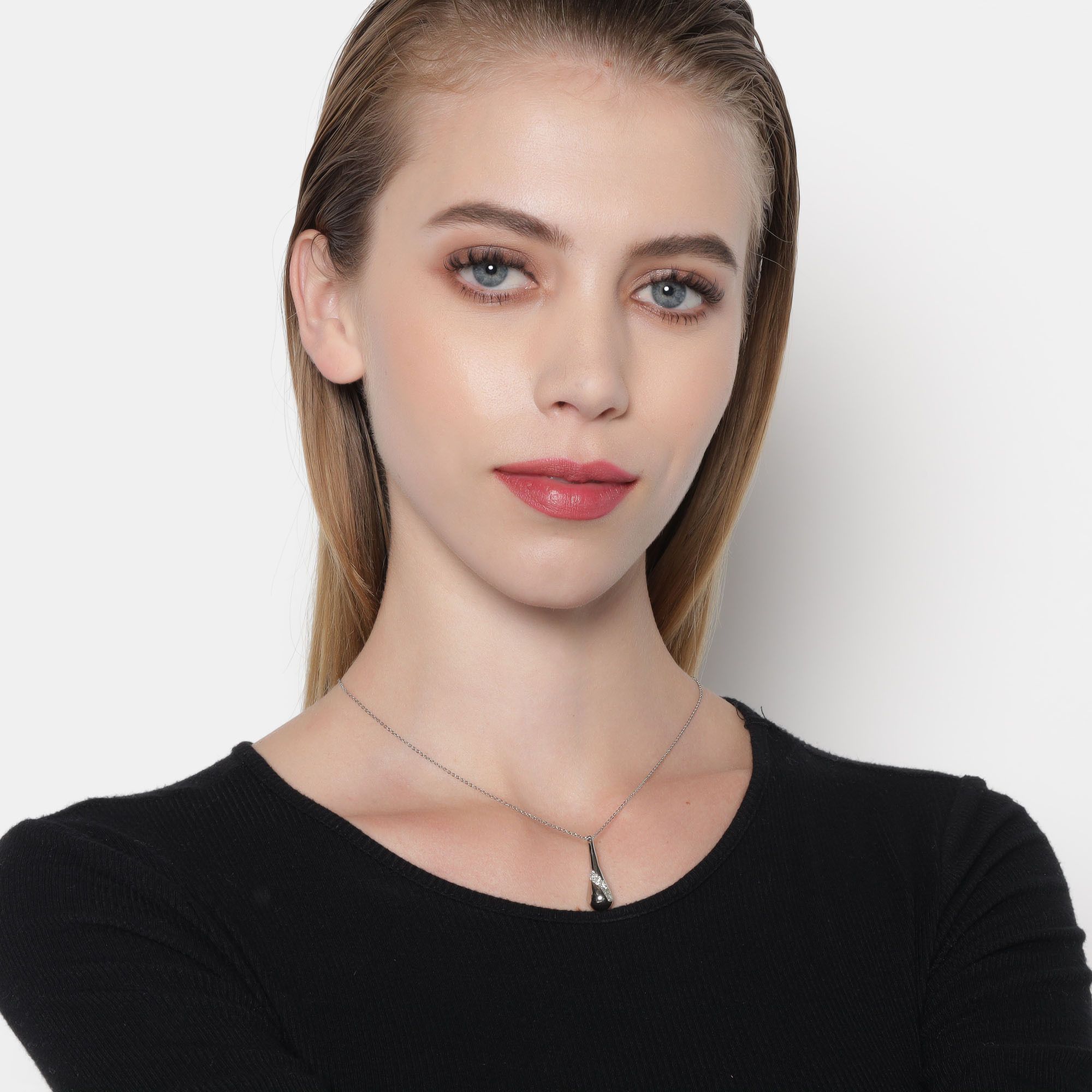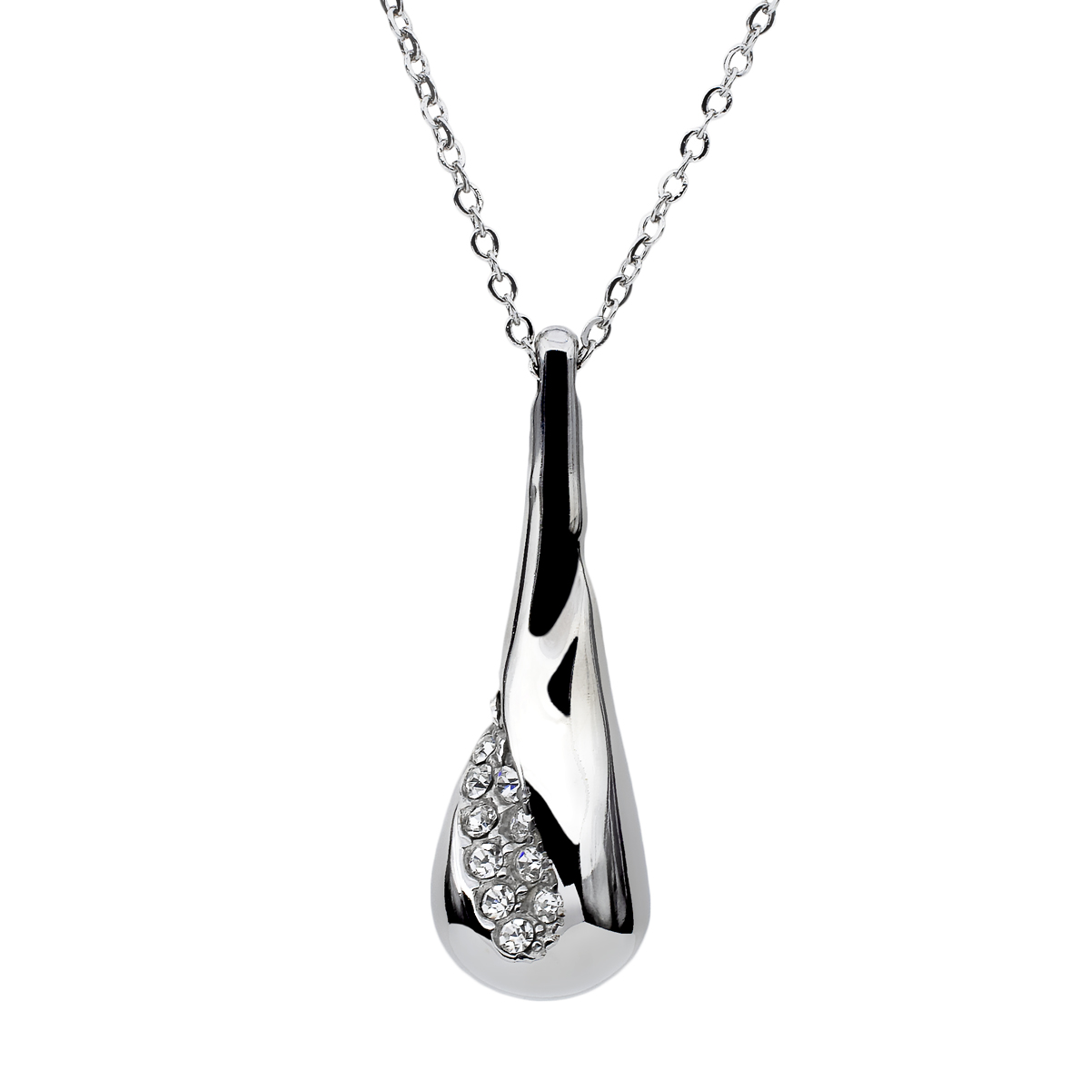 Dije con cadena en acero inoxidable blanco, diseño de gota con incrustaciones de cristales en color blanco.