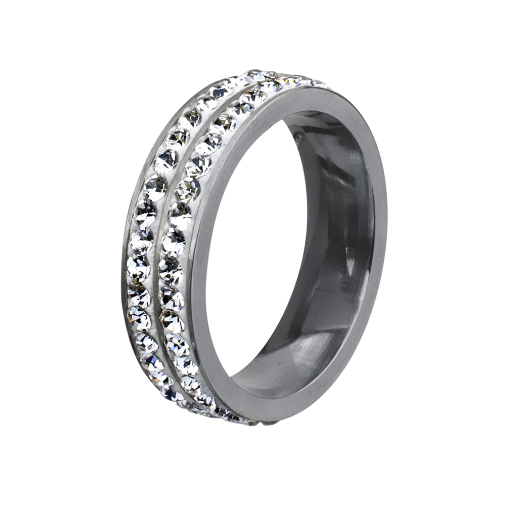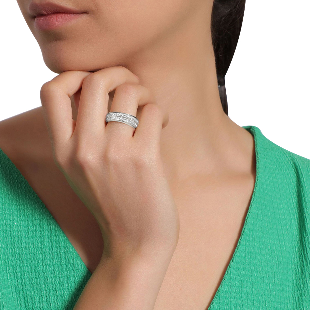 Elegante anillo, en baño de oro blanco de 18 quilates, diseño de anillo doble, con incrustaciones de cristales en color blanco.