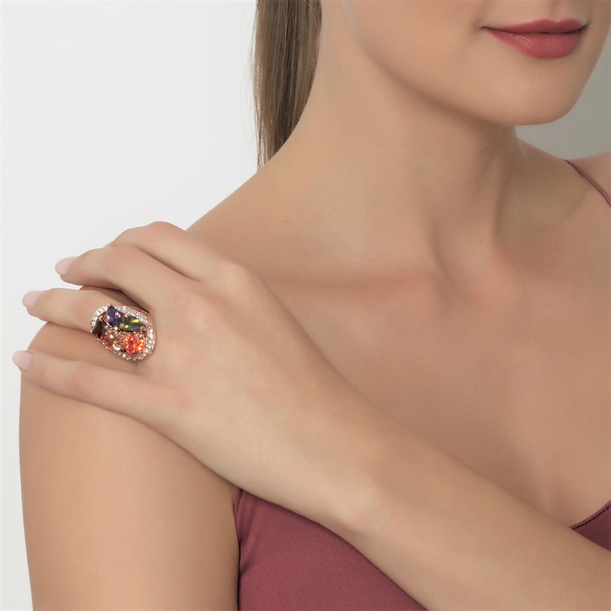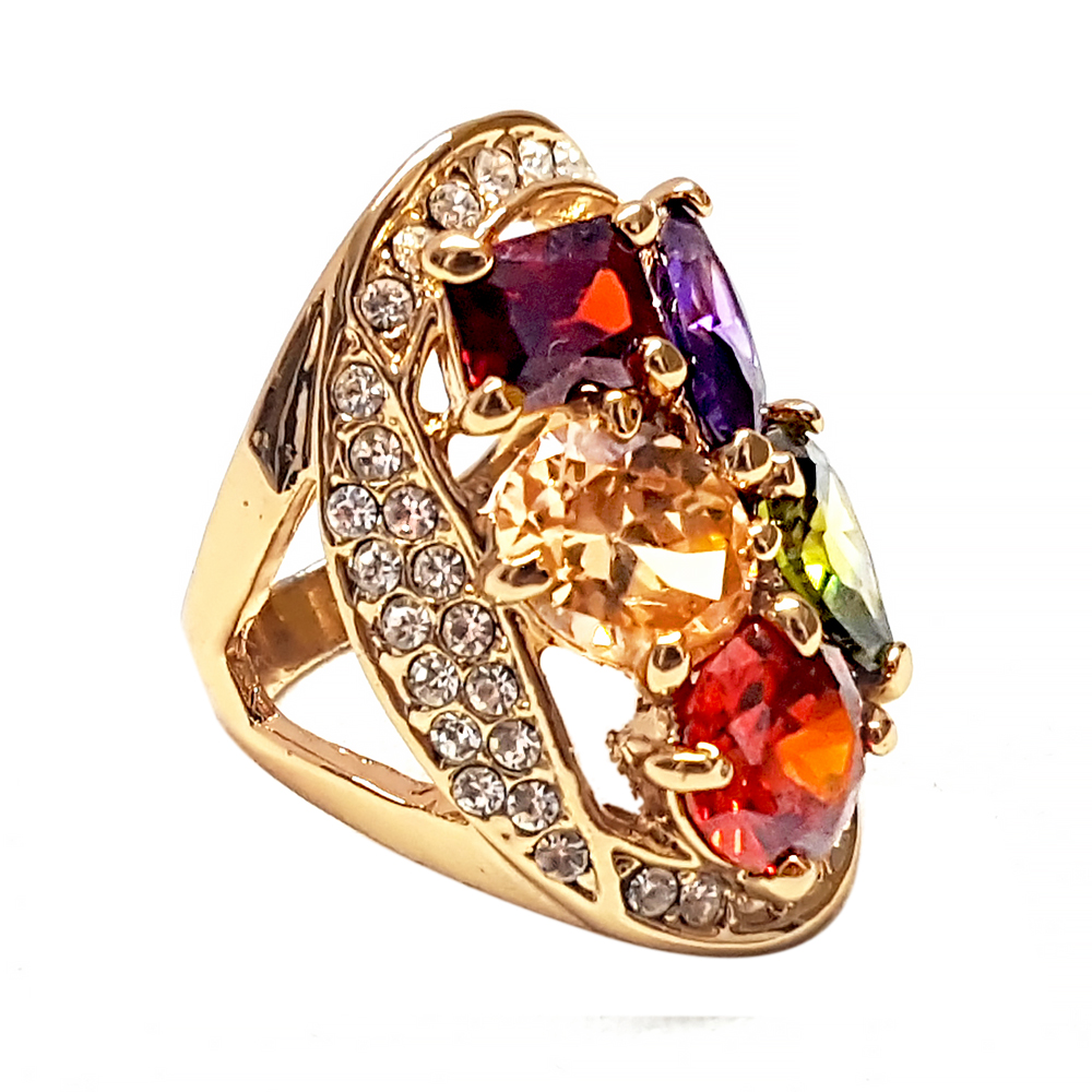 Exquisito anillo en baño de oro amarillo de 18 quilates, diseño ovalado, con incrustaciones de cristales en color blanco, ámbar, verde, morado y rojo.