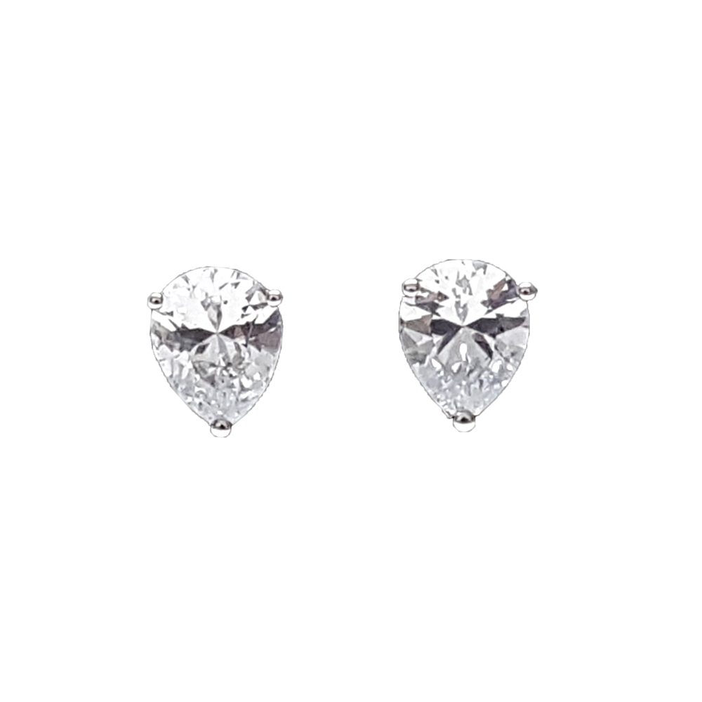 Delicados Aretes en baño de oro blanco de 18 quilates, diseño de gota, con incrustación de cristal en color blanco corte pera.