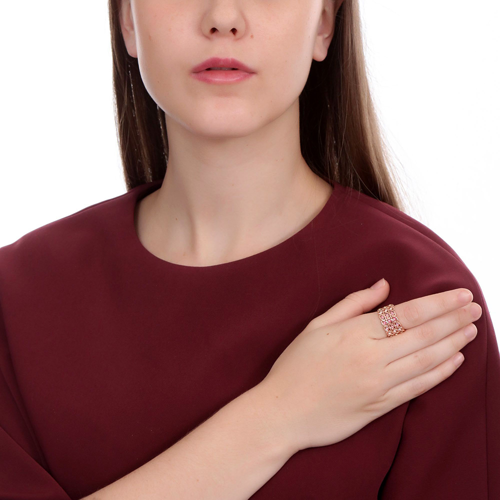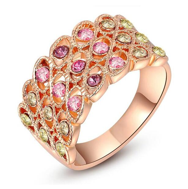 Lindo anillo en baño de oro rosa de 18 quilates, diseño de óvalos engarzados, con incrustaciones de cristales en colores.