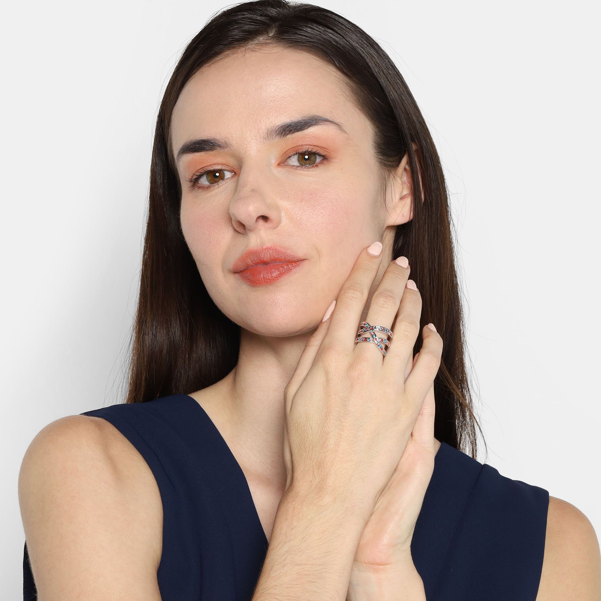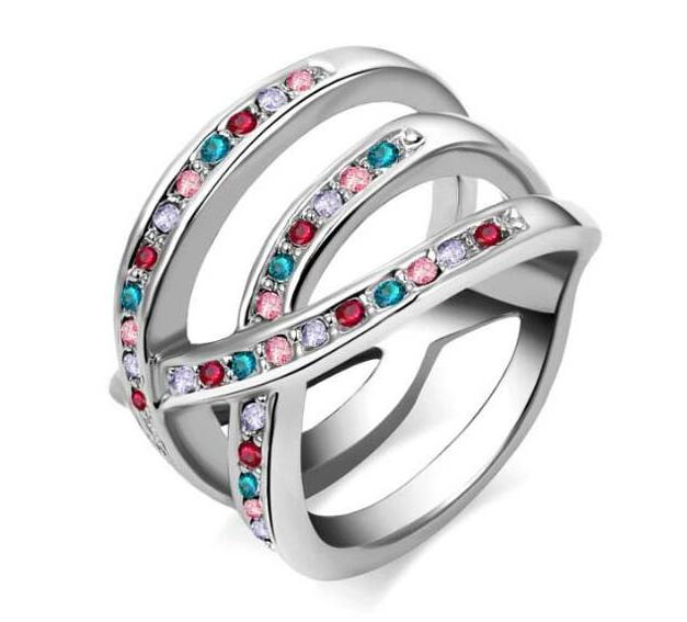 Lindo anillo, en baño de oro blanco de 18 quilates, fino diseño entrelazado, estilo multiaro, con incrustaciones de cristales en colores.