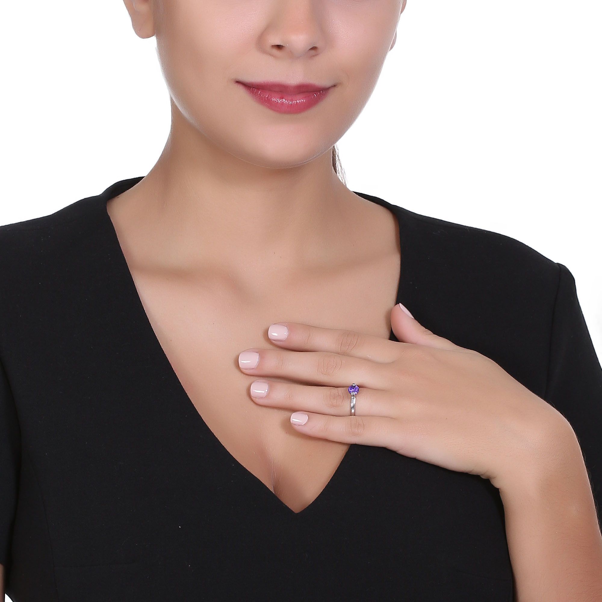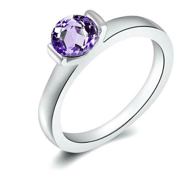Lindo anillo en baño de oro blanco de 18 quilates, fino diseño, con cristal morado corte brillante.