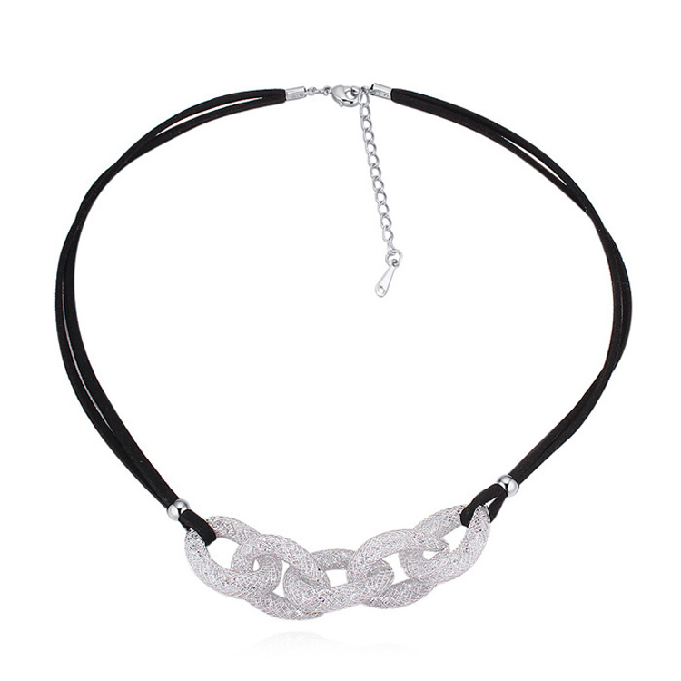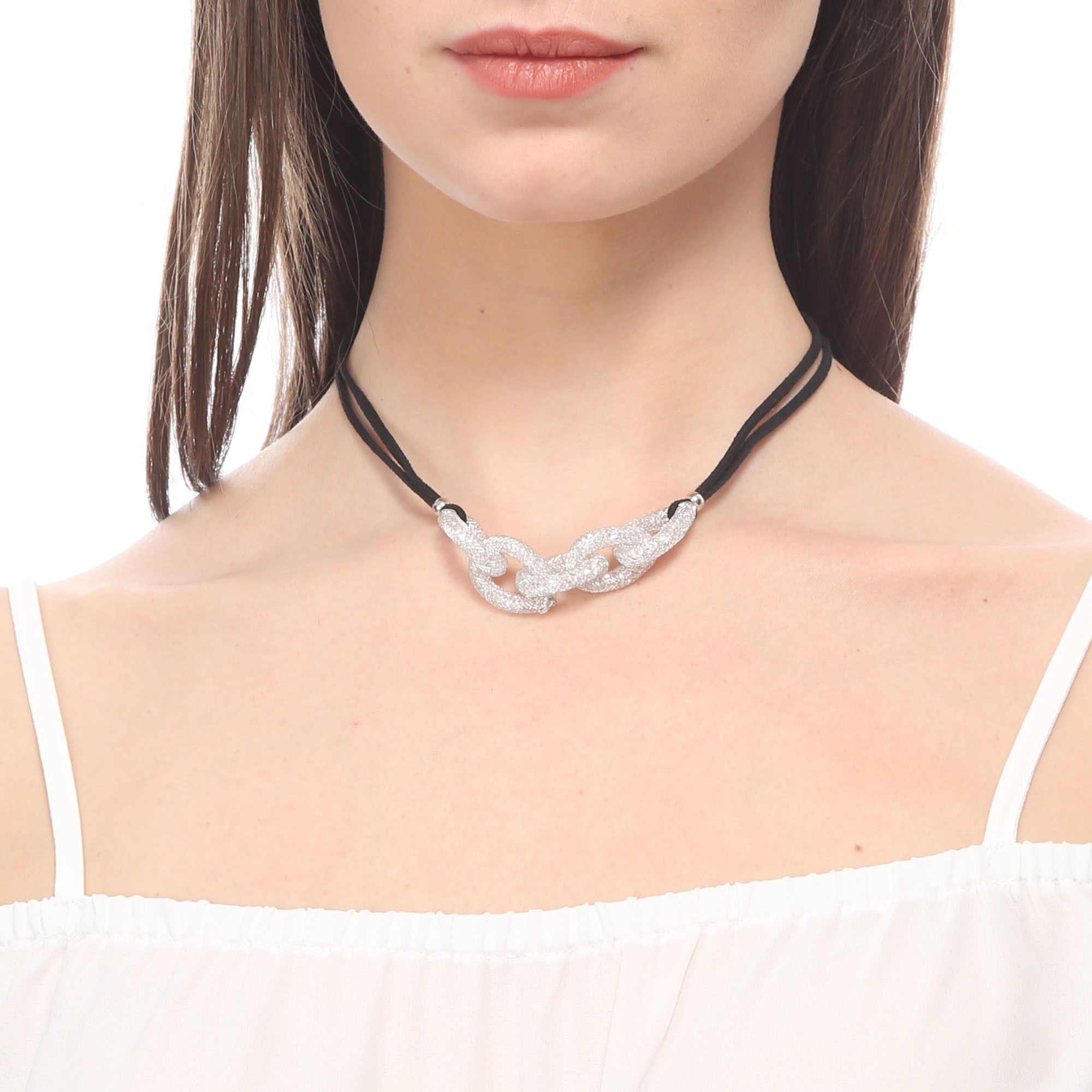 Collar con baño de oro blanco de 18 quilates, original diseño de eslabones en malla plateada, con cristales blancos y correa color negro.