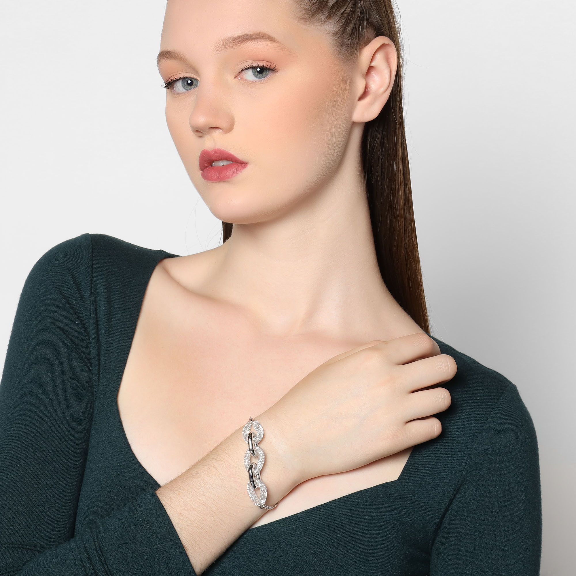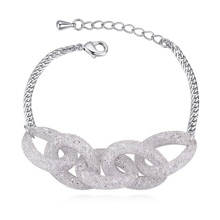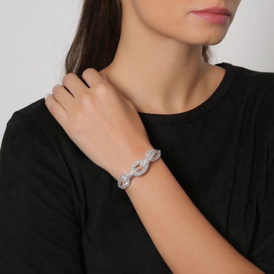 Pulsera en baño de oro blanco de 18 quilates y malla, diseño de eslabones, con cristales blancos dentro.