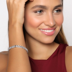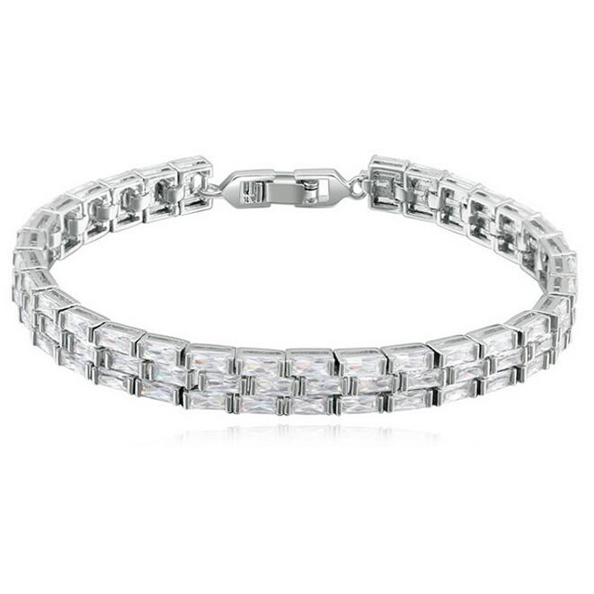 Pulsera en baño de oro blanco de 18 quilates, diseño engarzado, con cristales corte baguette en color blanco. Fabricado en una estructura de aleación de platino con rodio sin níquel.