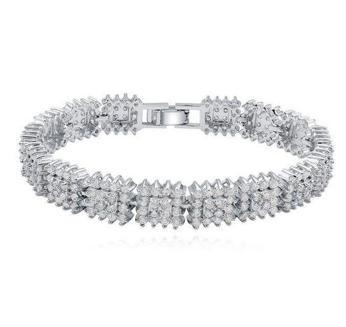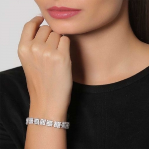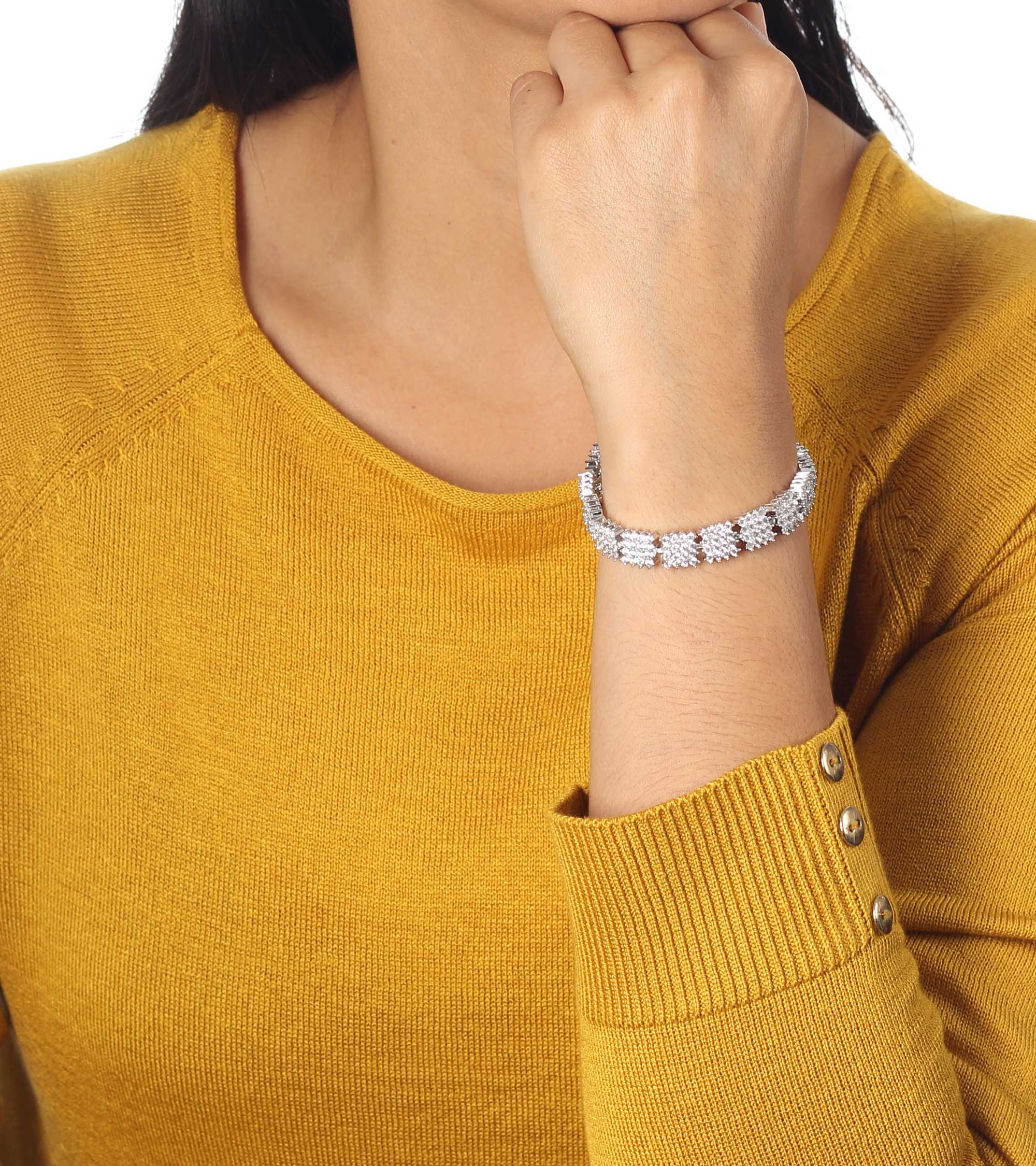 Pulsera en baño de oro blanco de 18 quilates, diseño de cuadros, con incrustación de cristales en color blanco.