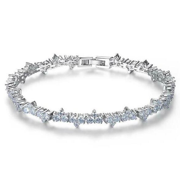 Pulsera en baño de oro blanco de 18 quilates, fino diseño, con cristales en color blanco corte brillante.
