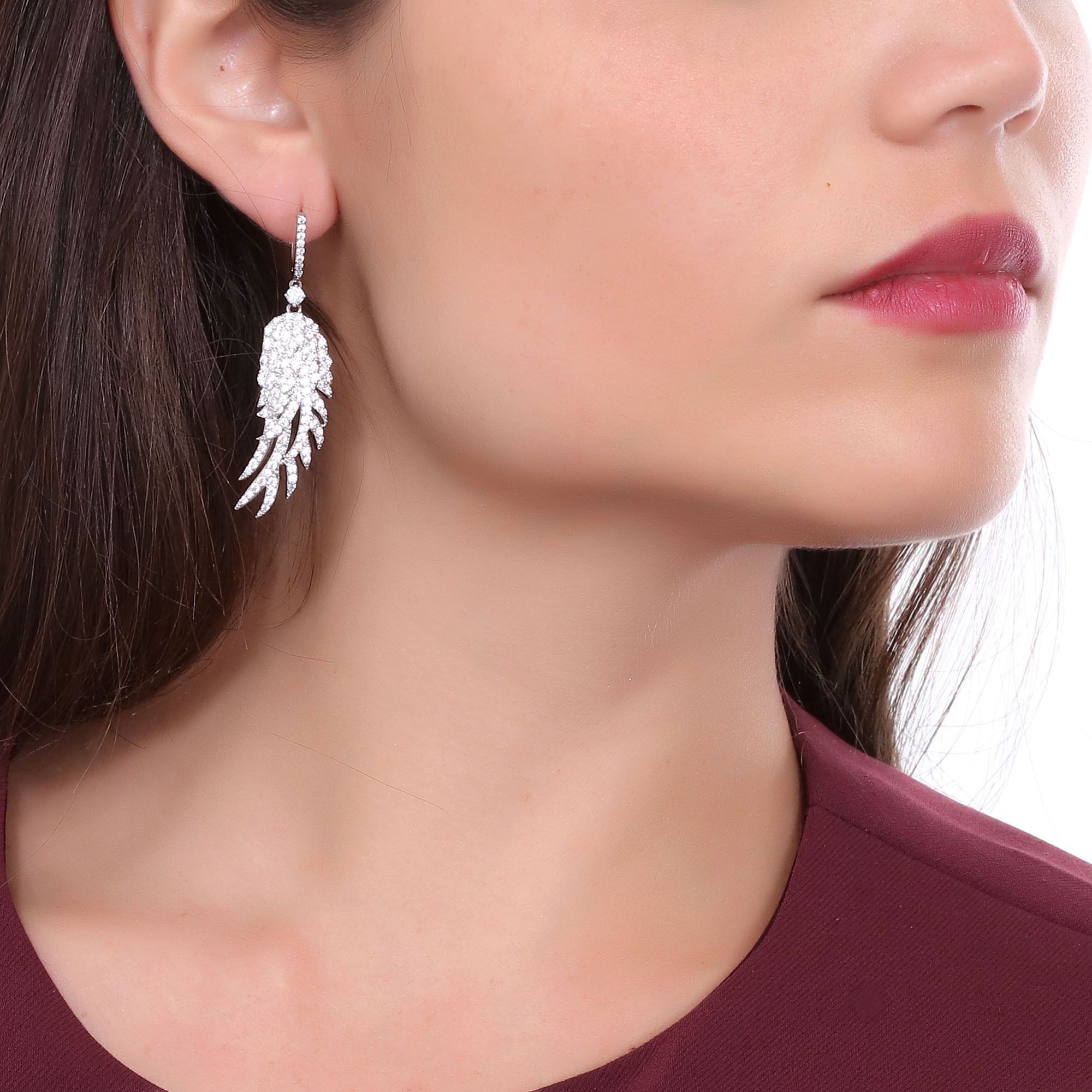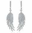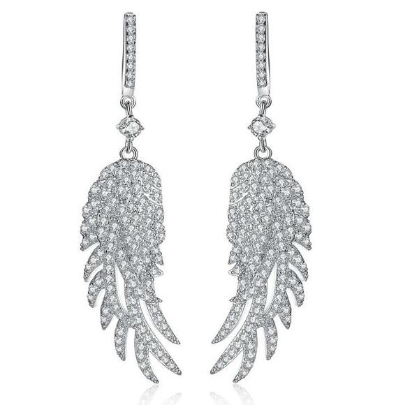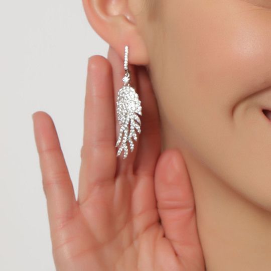 Hermosos pendientes, en baño de oro blanco de 18 quilates, diseño de alas, con incrustaciones de cristales en color blanco.