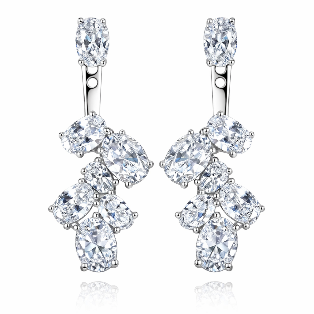 Aretes en baño de oro blanco de 18 quilates, fino diseño, estilo cascada, con incrustaciones de cristales blancos corte oval.