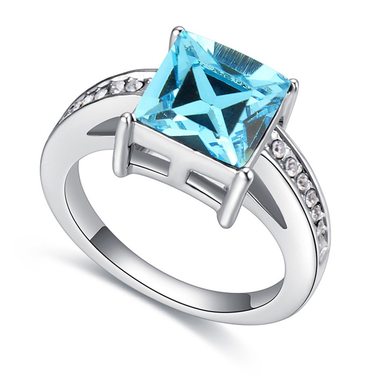Lindo anillo en baño de oro blanco de 18 quilates, fino diseño, con cristal azul corte princesa, e incrustaciones de cristales blancos.