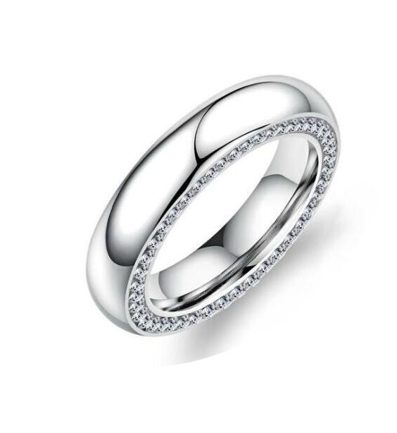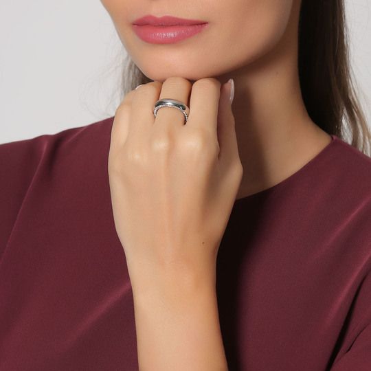 Original anillo en baño de oro blanco de 18 quilates, diseño convexo, con cristales blancos en el perfil.