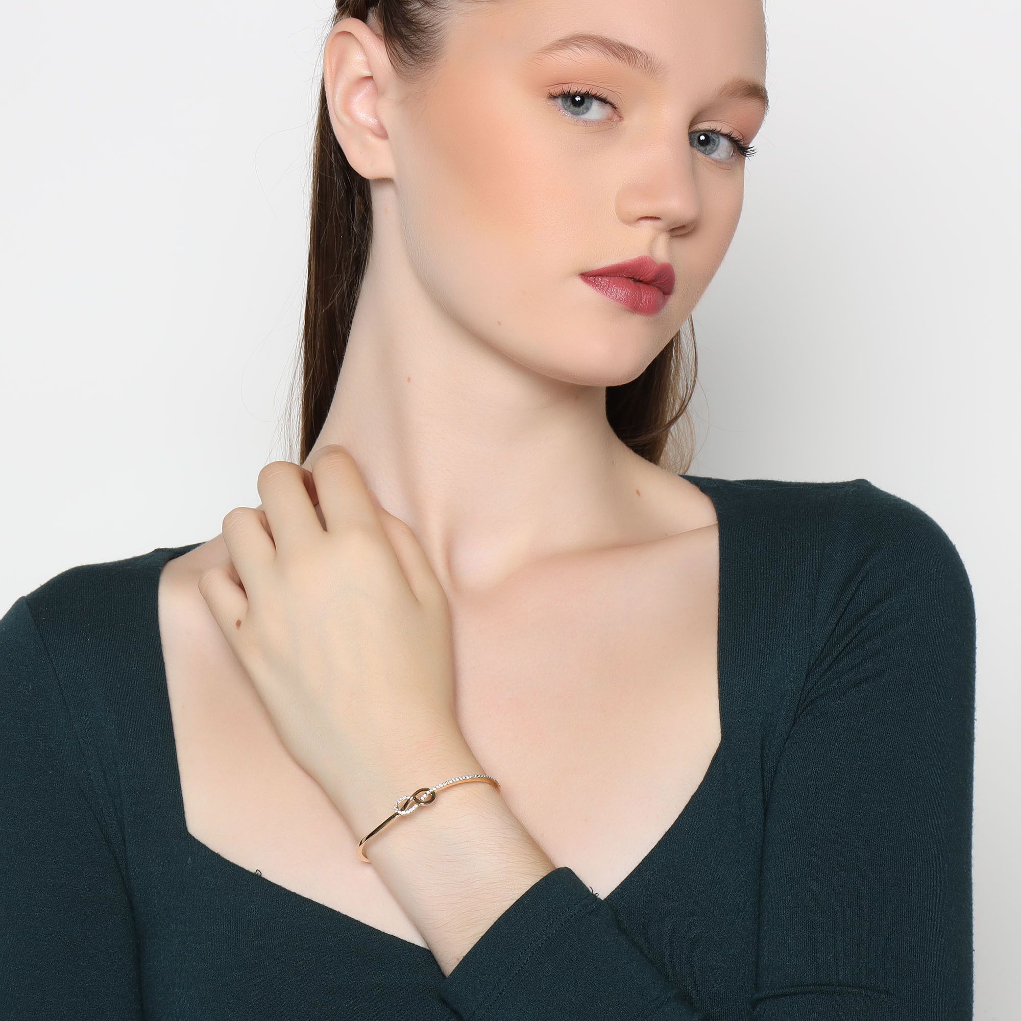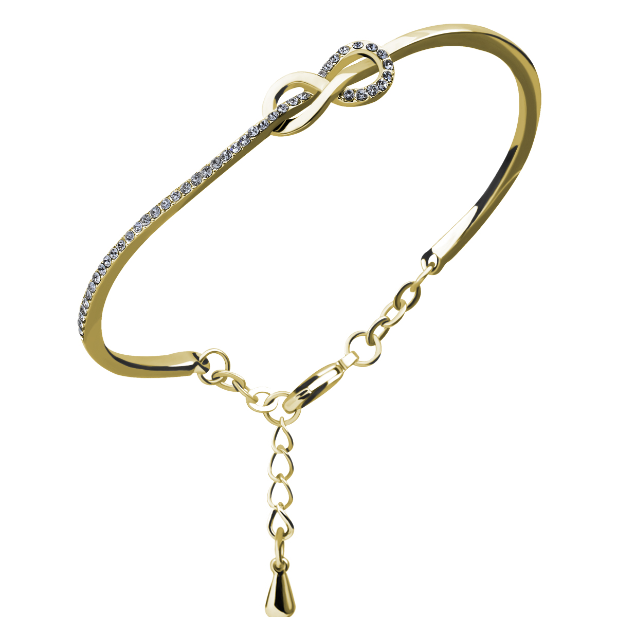 Delicado brazalete, en baño de oro amarillo de 18 quilates, diseño de infinito "∞", con incrustaciones de cristales en color blanco.