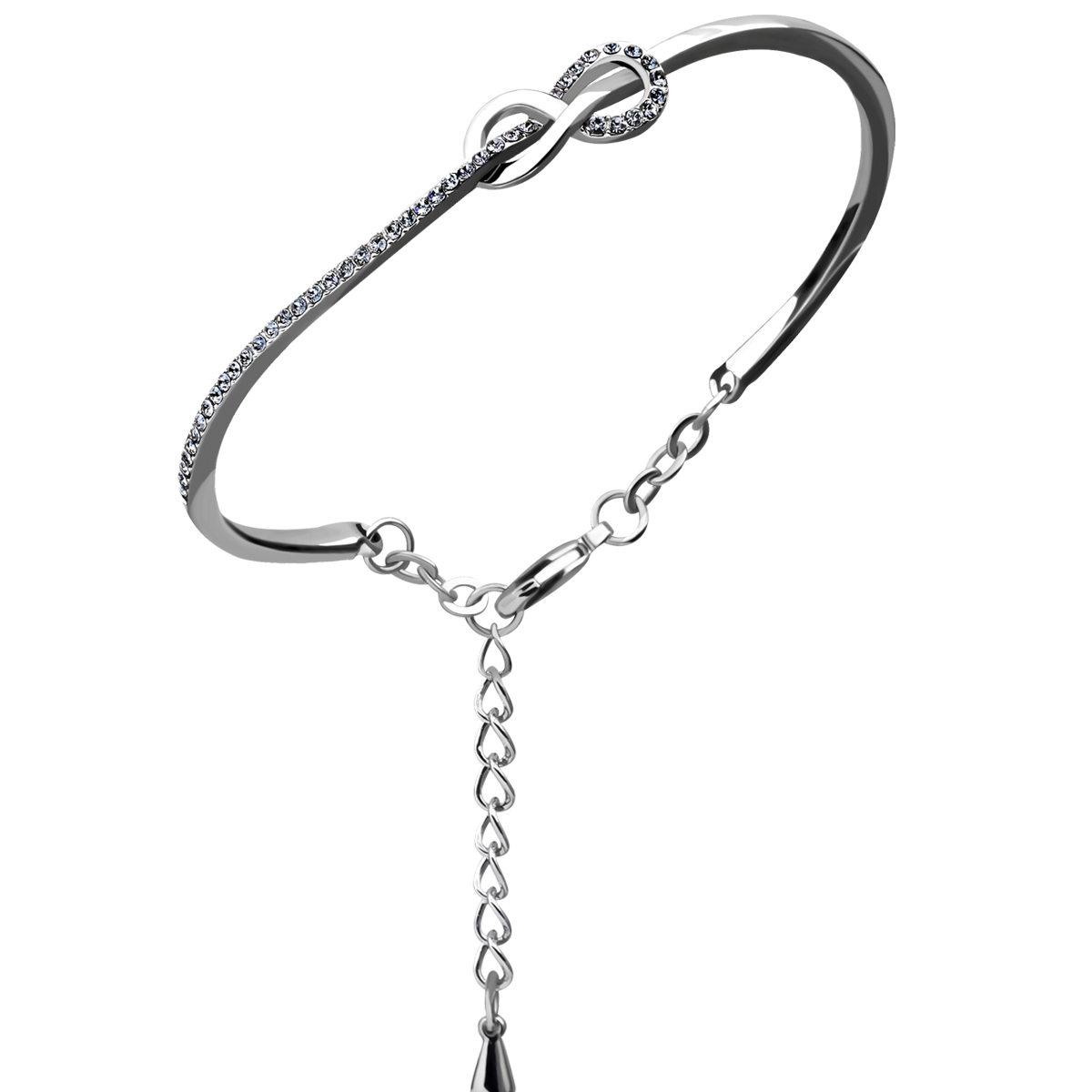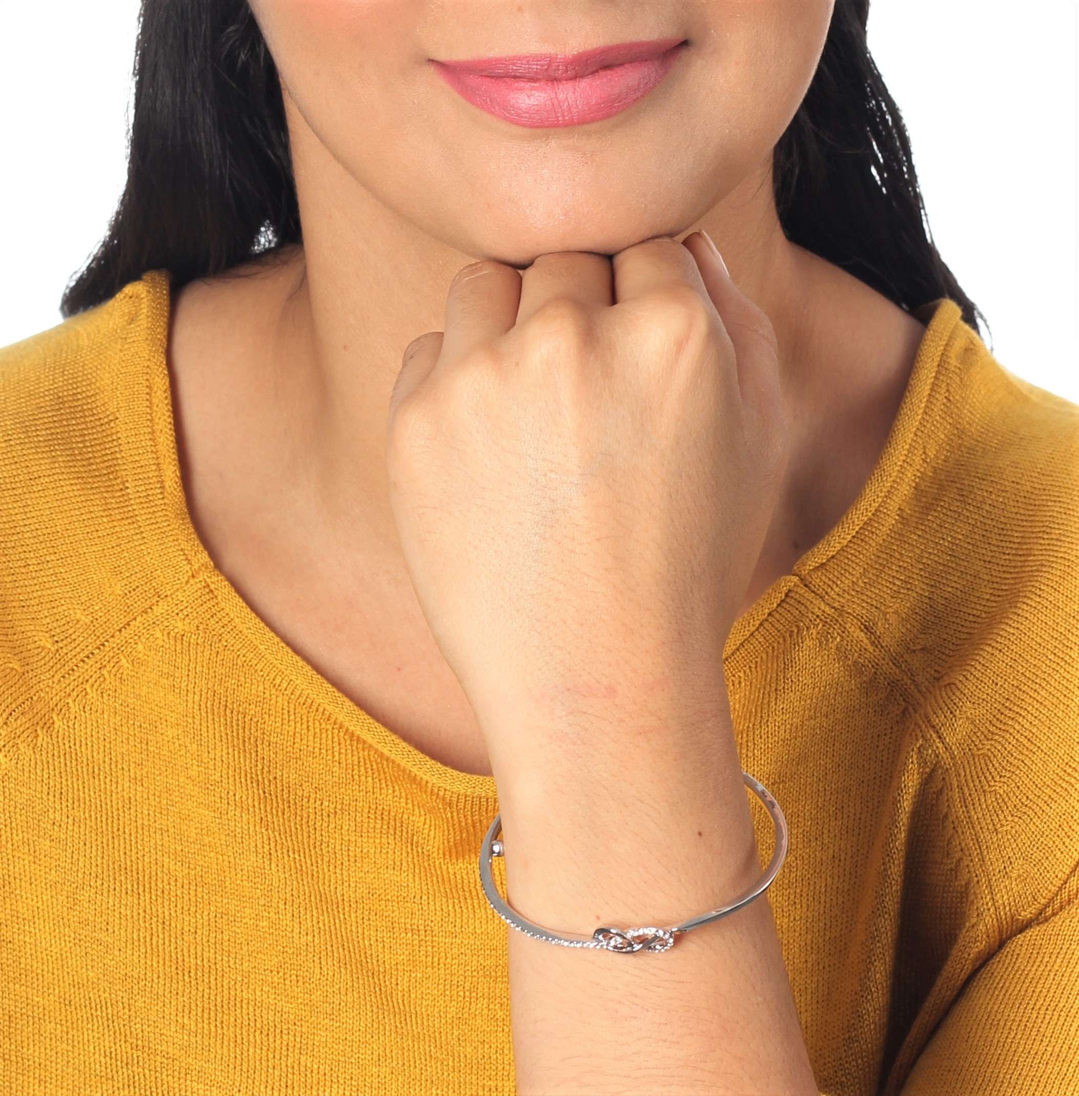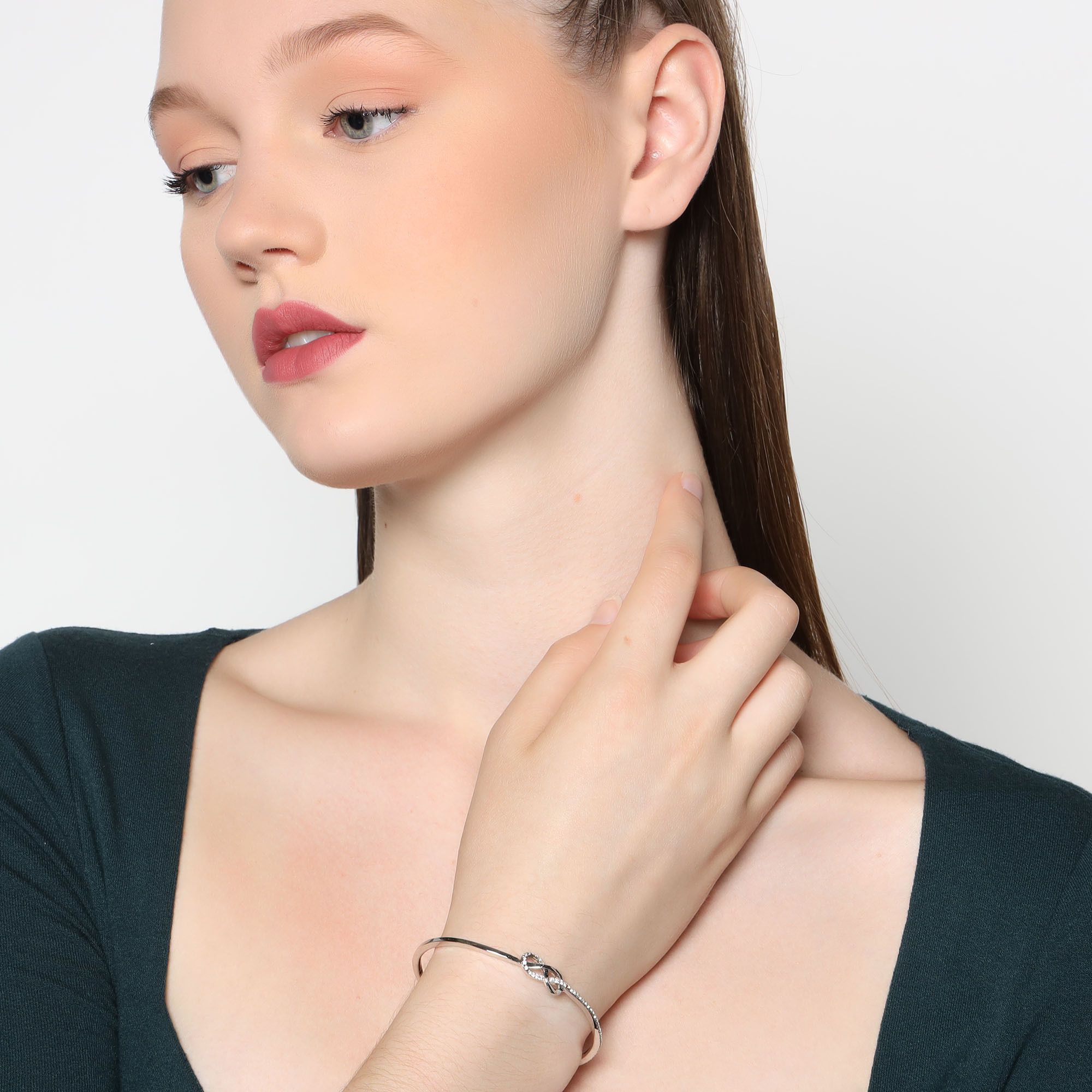 Delicado brazalete, en baño de oro blanco de 18 quilates, diseño de infinito "∞", con incrustaciones de cristales en color blanco.